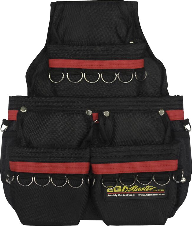 High-strength tool bags with 35 rings 2 bags with small pockets for tools Ring holder for hammer 15 Kg 3 kg in free fall 5 mm 813 mm to 1118 mm 32” to 44” Black and red