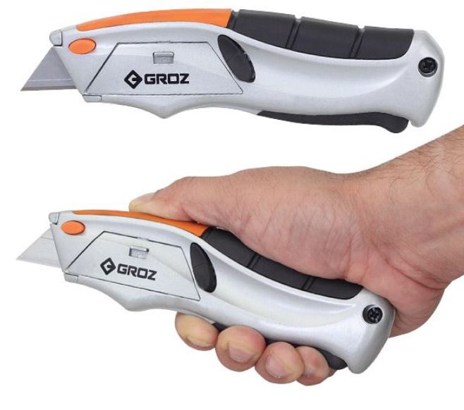 Heavy duty retractable safety knife for continuous use. Suitable for cutting plastic, rubber, wood, gaskets, cardboard, fibre, etc.