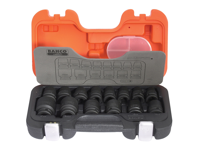 Bahco D/S14 1/2in drive impact socket set with a a black finish and made from high performance alloy steel. To be used with machines, for maxium safety use clamping springs.
