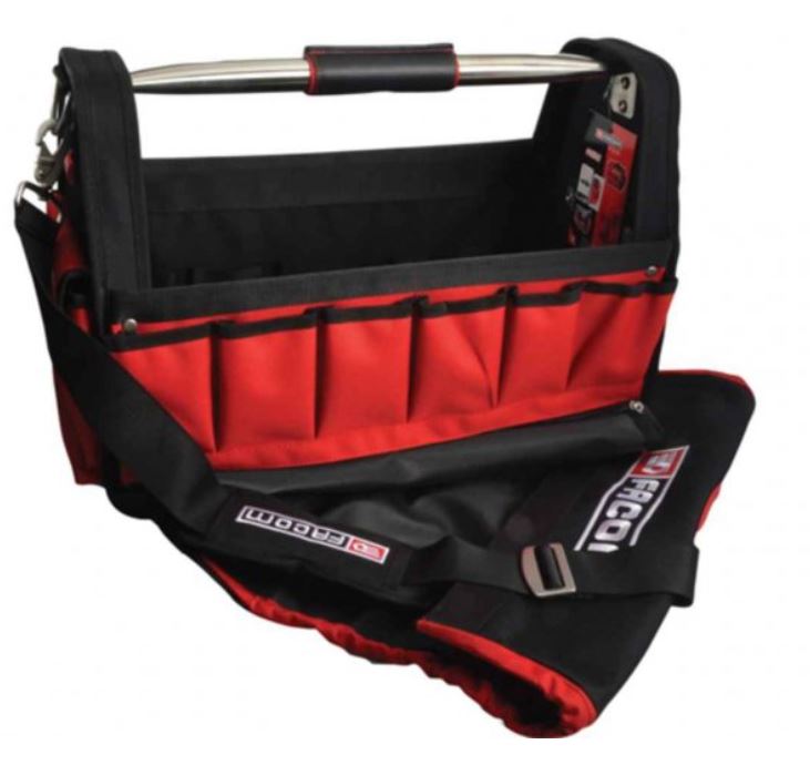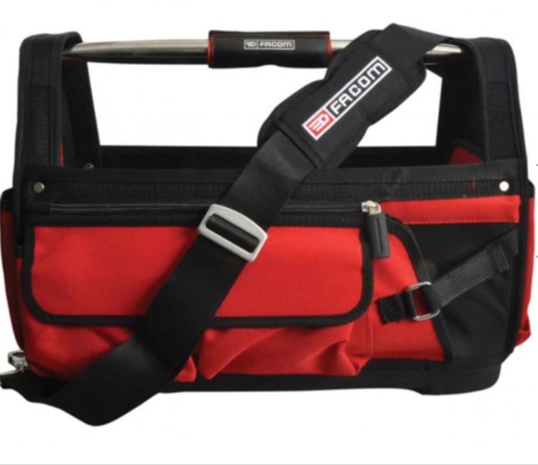The Facom soft tote bag is constructed from extra tough fabric. It offers maximum tool protection thanks to its rigid and waterproof plastic bottom and reinforced stress points. A heavy-duty steel handle with leather grip makes lifting more secure and comfortable. The open structure makes for quick and easy tool access as it keeps everything in place, and large side pockets provide extra storage. Complete with a clip-on strap for easy carriage.