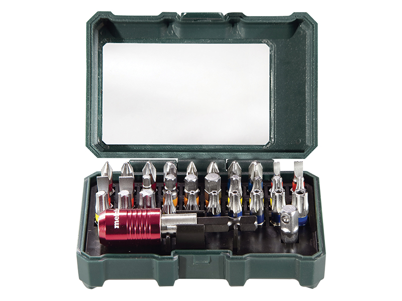 The bits in this Metabo 32 Piece Bit Set are made from chrome vanadium steel (S2 quality), and colour ring coding for quick and easy identification. Supplied in a high-quality, robust storage box with unique Metabo design. Also has an extendable toolbar hanger.