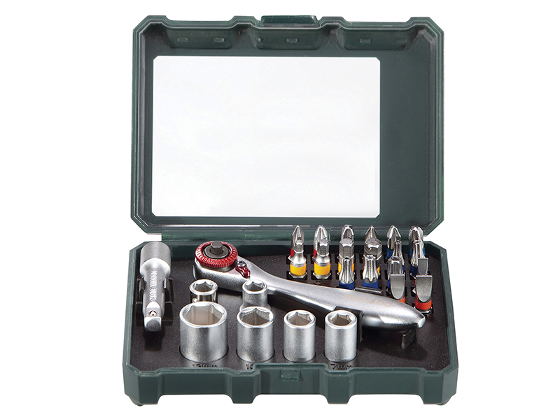 The bits in this Metabo 26 Piece Bit Set are made from chrome vanadium steel (S2 quality), and features colour ring coding for quick and easy identification. With high-quality, maxi drive ratchet sockets made from chrome vanadium steel.