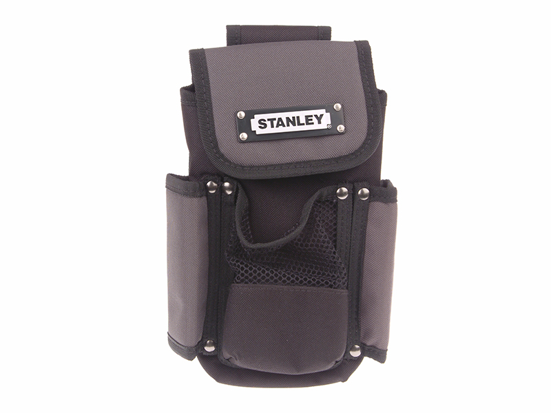 The Stanley 1-93-329 Pouch is made from heavy-duty 600 denier fabric which is double layered and riveted for extra durability. It has a large, uncovered pocket and two covered pockets for convenient tool storage.