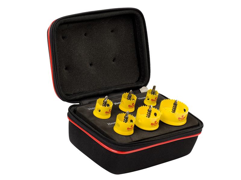 This Starrett Holesaw Kit is ideal for cutting stainless and mild steel sheeting, plasterboard, wood and thin plastics. The holesaws are constructed from heat-resistant, hardened steel with constant pitch teeth for exceptionally smooth cuts. Completely assembled ready for use. A safety stop collar at the base of the holesaw prevents travel beyond the holesaw depth.