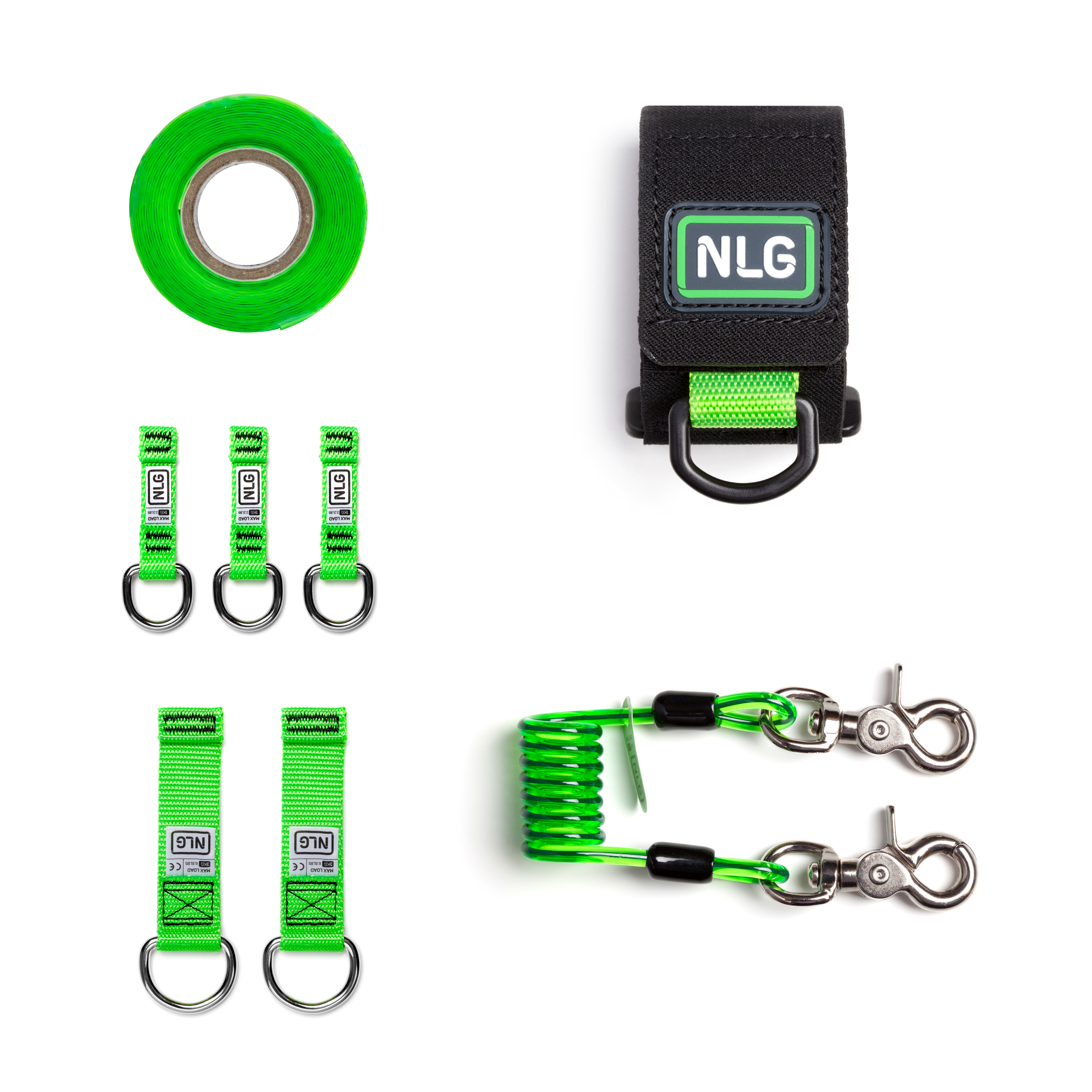 The NLG 5 Tool Tethering Kit provides equipment for up to 5 tools to be tethered. The NLG Tether Tape can create an instant tether point on almost any tool when used with the D Ring tethers. The short, wrist-mounted tool lanyard connects easily to the wristband.