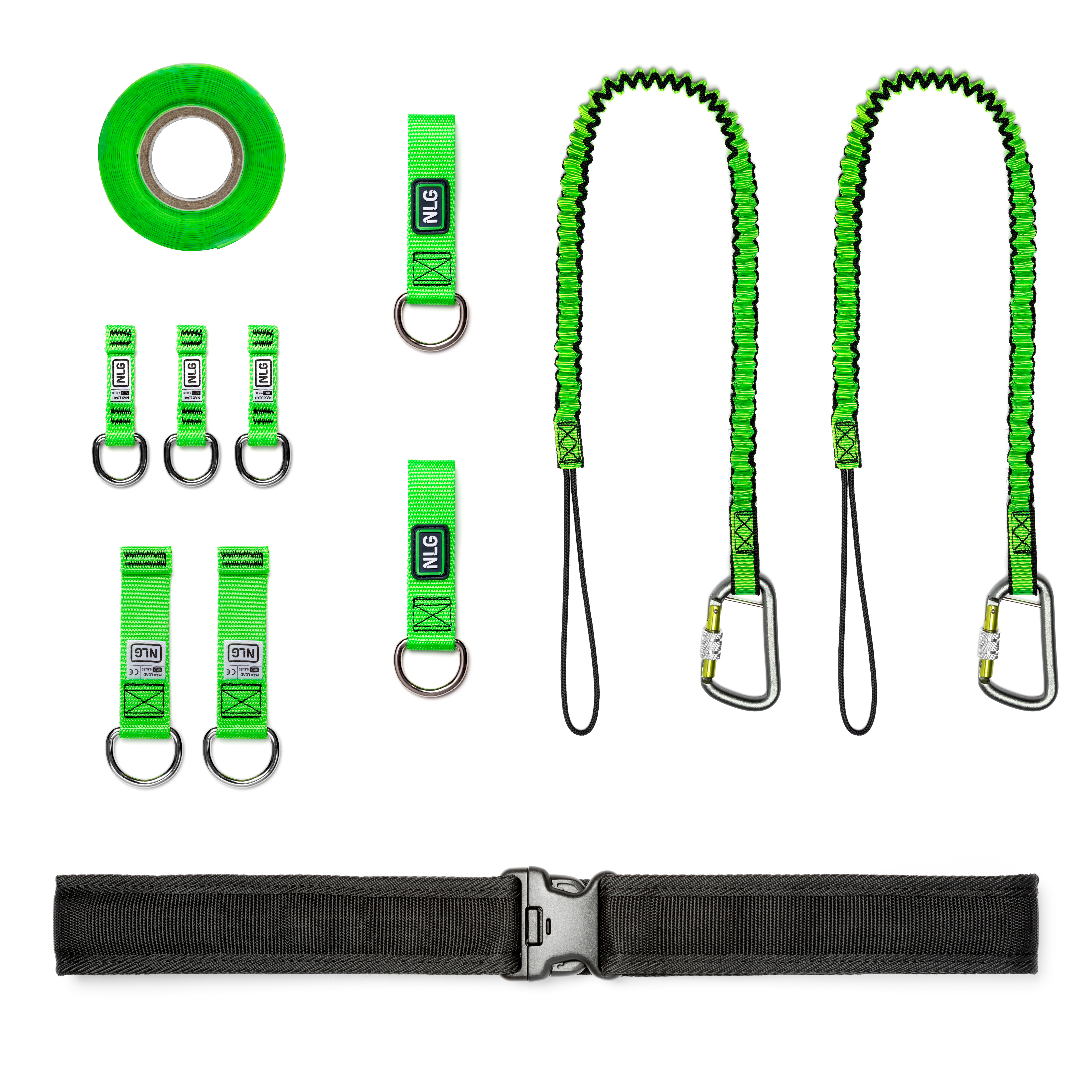 The NLG Construction Workers Kit is a quick way of tethering up to 5 tools. It contains the NLG Universal Belt with Belt Loops and combines to make a complete, ready-to-go tethering package with the NLG Tether Tape™ and NLG Tether Rings™ included.