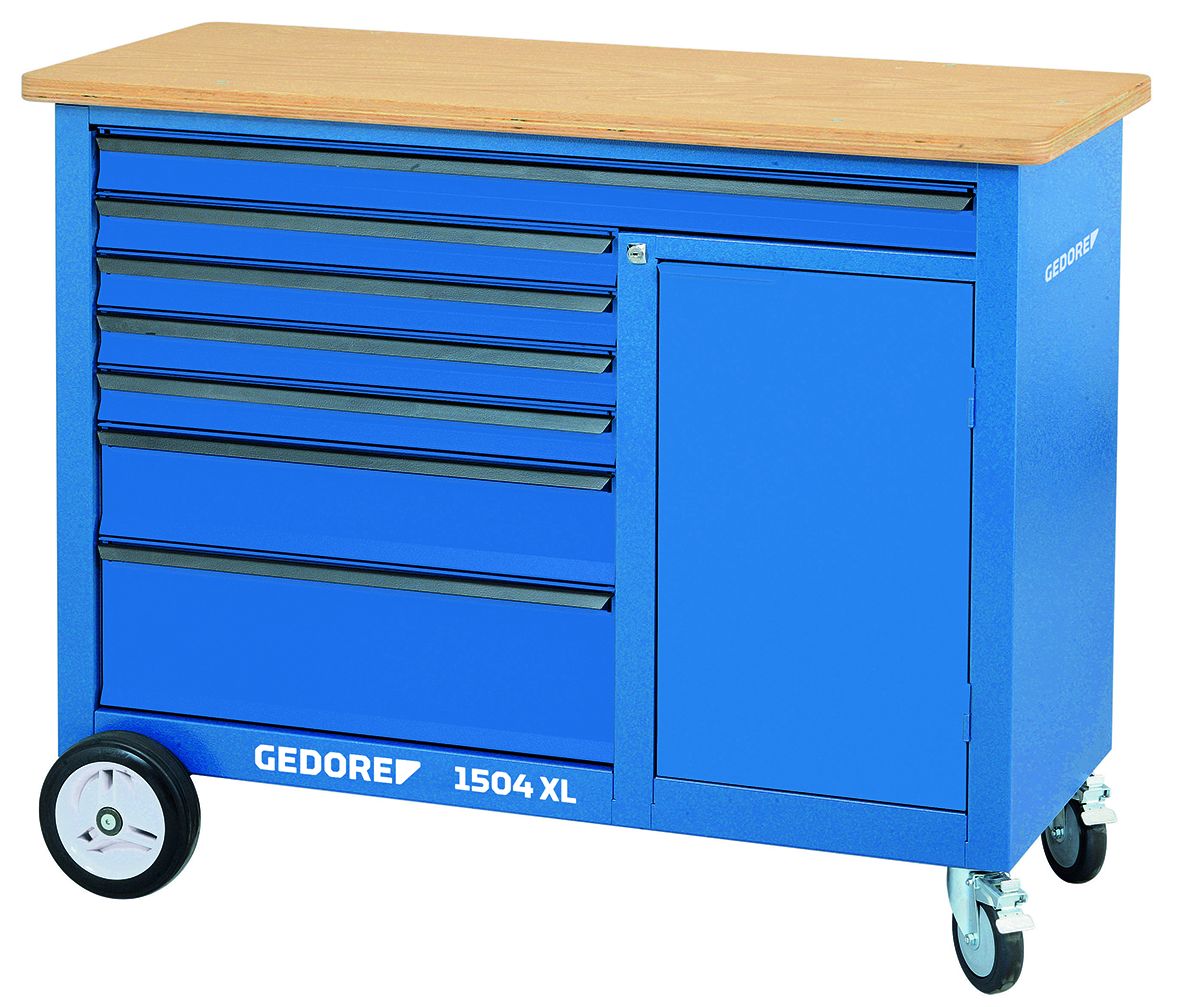 Body: • Dimensions: H 985 x W 1250 x D 550 mm • 30 mm thick multiplex beech wood worktop, surface additionally protected by linseed oil varnish • Large usable storage space with shelf and door • Heel protection for your safety • Sheet steel, corrosion resistant and scratch-proof powder-coated, GEDORE blue Drawers: • Central locking with cylinder lock • 1 XL drawer (W 1055 x D 400), 6 wide drawers (W 640 x D 400 mm) fully extendable, removable • Each drawer with safety locking, single-hand operation • Ball-bearing guide rails • Can be individually equipped with lengthwise and crosswise dividers (can be ordered individually) • Load capacity per drawer 40 kg, bottom heavy-duty drawer 60 kg • Sheet steel, corrosion resistant and scratch-proof powder-coated, GEDORE blue GEDORE High-performance chassis: • Total load capacity 700 kg, 500 kg when mobile • 2 high-performance wheels on roller bearings (fixed castors Ø 200 mm) • 2 smooth running wheels on ball bearings (swivel castors Ø 125 mm), both with total brake • The GEDORE trapezoidal axle construction secures smooth running, manoeuvrability and track-keeping also in case of maximum loads Accessories: • 10 length- (LT) and 2 crosswise (QT) dividers from zinc-plated sheet steel Options: • Can be equipped with GEDORE tool modules (1500 ES/1500 CT or 2005 CT) • Rear panel R 1504 XL-L can be added • Further drawer combinations on request • Special colours and designs available on request • Delivery without tools and accessories