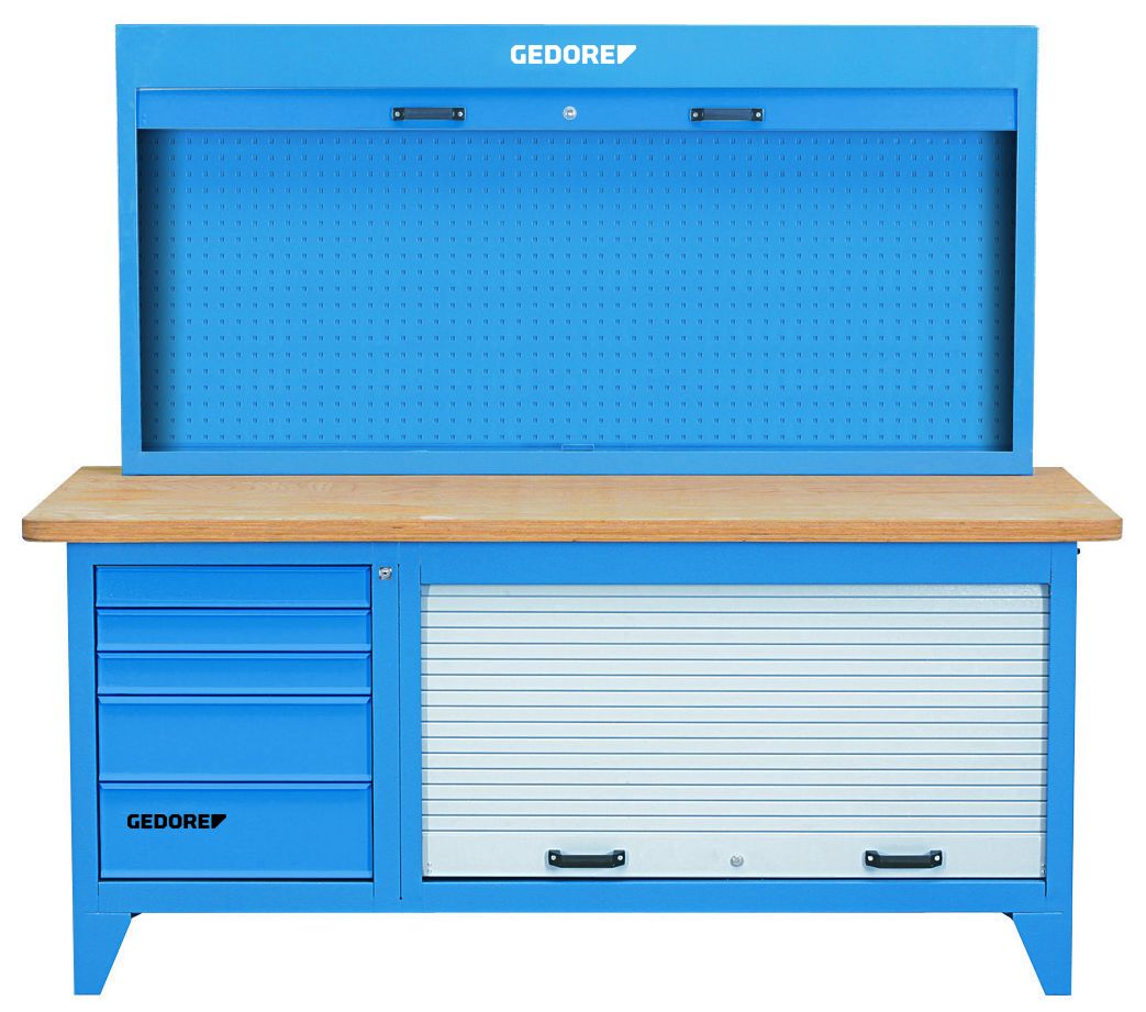 Body workbench: • Dimensions: H 900 x W 2000 x D 875 mm • 40 mm thick multiplex beech wood worktop, surface additionally protected by linseed oil varnish • Large storage space with shutter • Heel protection for your safety • Sheet steel, corrosion resistant and scratch-proof powder-coated, GEDORE blue Body cabinet: • Dimensions: H 890 x W 1810 x D 170 mm • Shutter with cylinder lock • Rear panel with square perforation 10 x 38 mm to fix hooks and tools • Sheet steel, corrosion resistant and scratch-proof powder-coated, GEDORE blue • Shutter from sheet steel, corrosion resistant and scratch-proof powder-coated, GEDORE grau Drawers workbench: • Separate central locking of drawers and shutter with cylinder locks • 5 wide drawers (W 480 x D 550 mm), extendable up to 505 mm, removeable • Ball-bearing guide rails • Can be individually equipped with lengthwise and crosswise dividers (can be ordered individually) • Load capacity per drawer 40 kg • Sheet steel, corrosion resistant and scratch-proof powder-coated, GEDORE blue • Total load capacity (workbench) 2000 kg Accessories: • 85-piece hook assortment 1500 HS 23 • 9 length- (LT) and 9 crosswise (QT) dividers from zinc-plated sheet steel Options: • Can be equipped with GEDORE tool modules (1500 ES/1500 CT) • Special colours and designs available on request • Delivery without tools and accessories