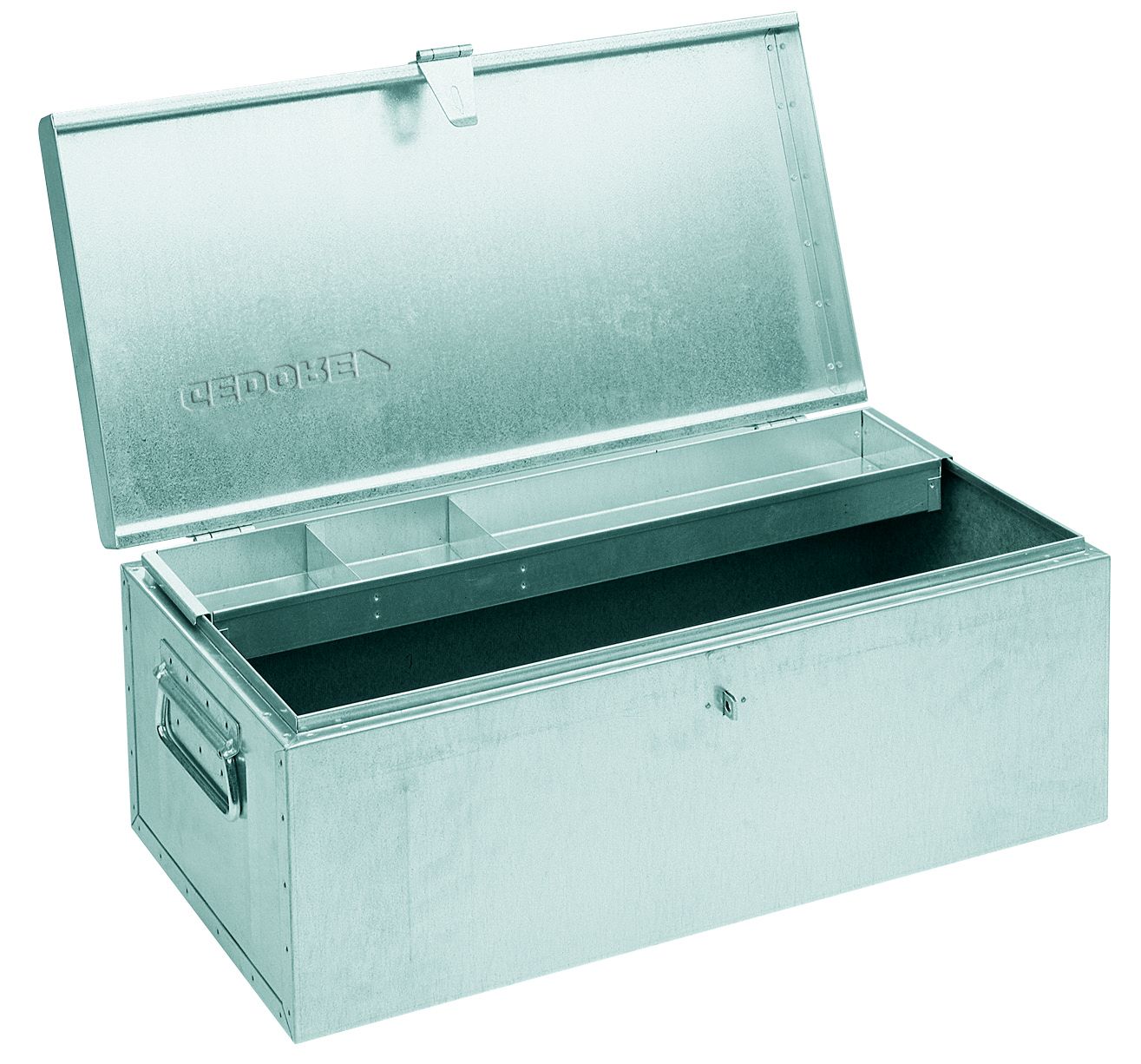 • In special zinc-plated sheet steel for the heavy everyday-use • Optimum corrosion protection, spray water protected • Manufactured in pressure jointing technique, guarantees highest sturdiness • Robust metal fittings and protected hinges • Stopper to hold the lid open • Wide carrying handles • Max. loading 150 kg • Lockable through padlock • Lined interior • Removable tray for small parts (ES 1440)