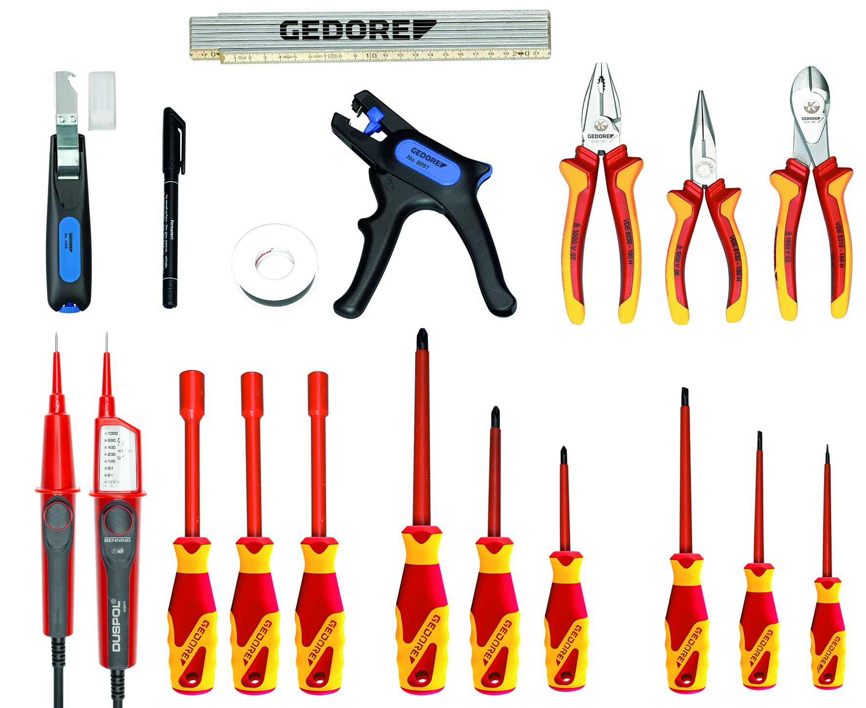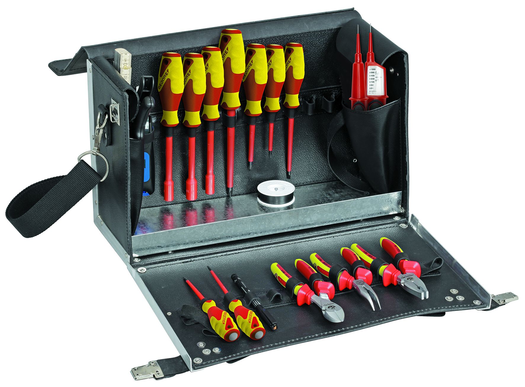 • Robust tool case with 18-piece basic assortment • Particularly suitable for beginners in electronic professions • From eco-friendly tanned cowhide • Carefully processed with strong industrial seams • Base insert from zinc-plated sheet steel • Edges reinforced with aluminium angle brackets, metal parts durable riveted • With feet to protect sensitive surfaces • Front part can be lowered for quick access to the tools, with two key locks to prevent inadvertent opening • Removable carrying strap with shoulder protector and sturdy carrying handle • Anti-theft protection due to two lockable notches, delivery includes two keys • Document partition • Interior measurements 430 x 200 x 290 mm