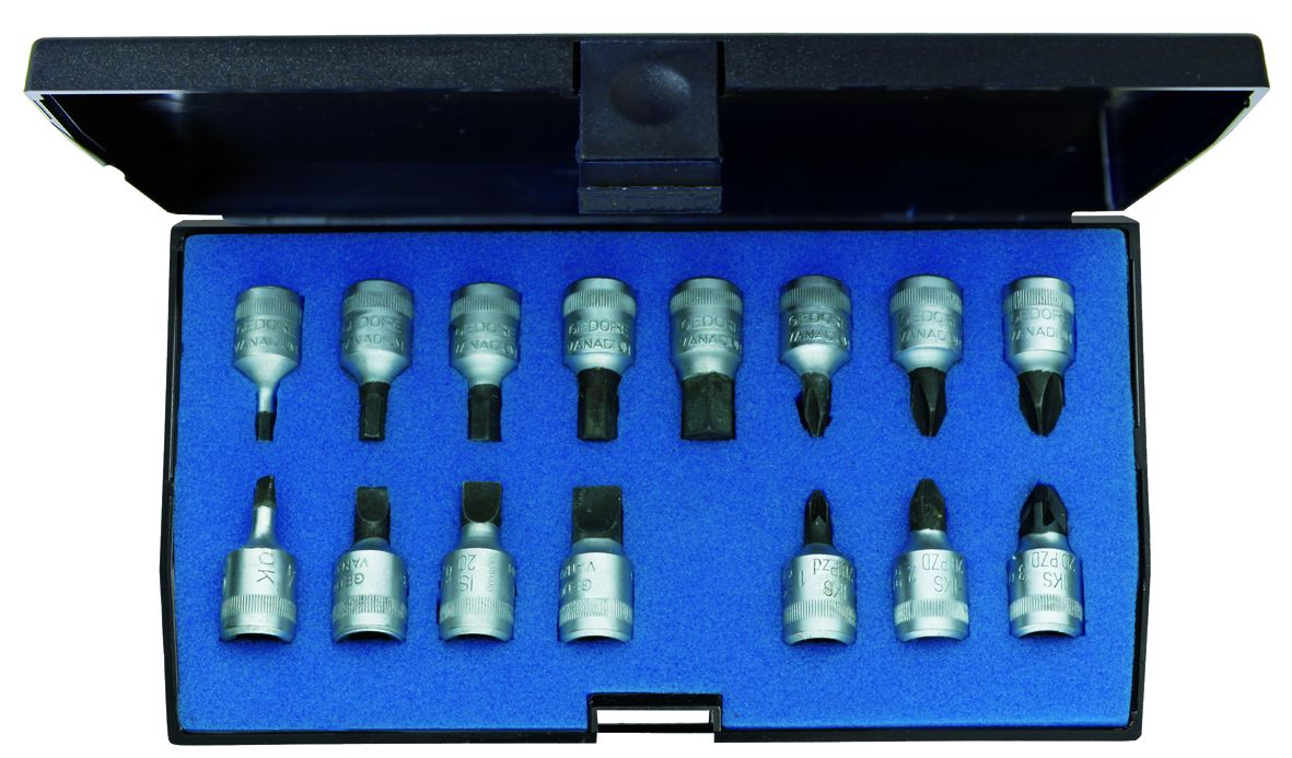 With hand-operated screwdriver bit sockets in GEDORE vanadium special steel • In plastic case • Dimensions: 160 x 95 x 38 mm