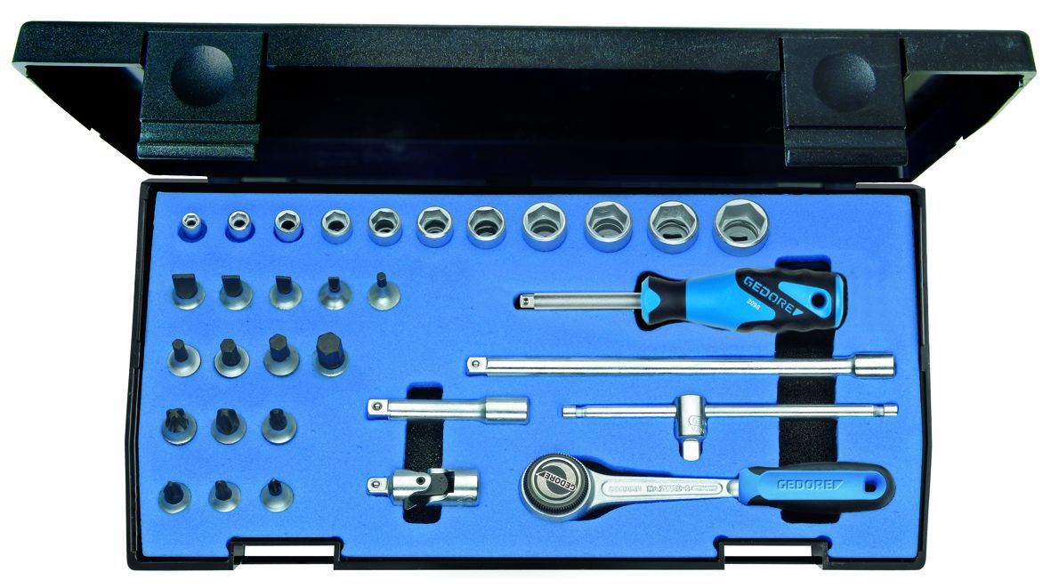 With forged, tempered hexagon sockets, hand-operated • With accessories made from GEDORE vanadium steel 31CrV3 • With fine toothed, dial change ratchet • In plastic case • Dimensions: 275 x 150 x 42 mm