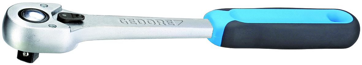 • Particularly for the demanding use experienced in industry and with utility vehicles • Acc. to DIN 3122, ISO 3315 • With recessed lever change • Locks in the middle position: When the lever is flipped, it automatically engages for clockwise or counterclockwise operation • Push-button release • Return angle 11.25 degrees • Non-slip 2-component handle with hanging hole • For hand-operated sockets and accessories with square drive as per DIN 3120 - C 10, ISO 1174, ball locking device • GEDORE vanadium steel 31CrV3, chrome-plated