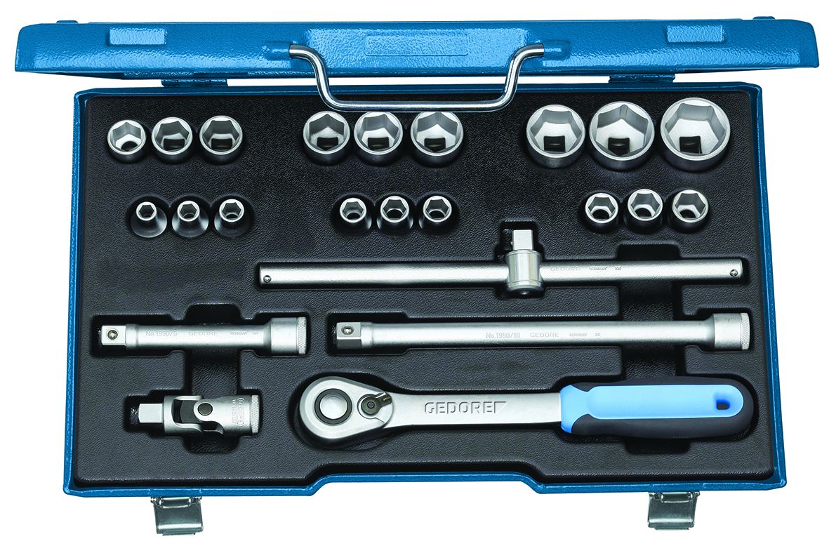 • With forged, tempered hexagon (no.19) or UD profile sockets (no. D 19), hand-operated • With accessories made from GEDORE vanadium steel 31CrV3 • Set U-20 with robust lever-change reversible ratchet, with push-button release • Set U-3 with fine toothed, dial change ratchet • In GEDORE blue sheet steel case • Dimensions: 425 x 277 x 55 mm