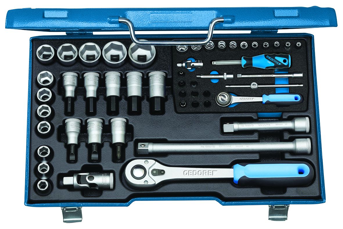 • With forged, tempered hexagon or UD profile sockets, hand-operated • With accessories made from GEDORE vanadium steel 31CrV3 • 1/4" with fine toothed, dial change ratchet U-3 • 1/2" with reversible lever change ratchet U-10 T • In GEDORE blue sheet steel case • Dimensions: 425 x 277 x 55 mm