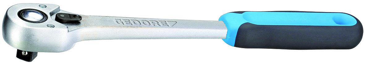 • Particularly for the demanding use experienced in industry and with utility vehicles • Acc. to DIN 3122, ISO 3315 • With recessed lever change • Push-button release • Return angle 7.5 degrees • Non-slip 2-component handle with hanging hole • Locks in the middle position: When the lever is flipped, it automatically engages for clockwise or anti-clockwise operation • For hand-operated sockets and accessories with square drive as per DIN 3120 - C 12.5, ISO 1174, ball locking device • GEDORE vanadium steel 31CrV3, chrome-plated