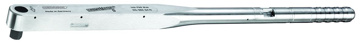 Use: • Controlled screw tightening in the range 155-760 N·m / 115-560 lbf·ft • For use in almost all industrial manufacturing areas Features: • Classified to DIN EN ISO 6789:2003 Type II Class A, with a factory certificate. Working accuracy: +/- 3 % tolerance of scale set torque. The specification of the standard (+/- 4 %) is exceeded. • 3/4" square drive with pin-locking mechanism DIN 3120 - B 20, ISO 1174 • Automatic short-path actuation with tactile impulse and audible signal • Dual scale with a scale graduation of 10 N·m and 10 lbf·ft Technical advantage/Function: • Lightweight and robust (as housing is made of an aluminium alloy), very workshop-friendly • No inaccuracies whether used with both hands or held away from the handle (as for standard torque wrenches). Both the square drive and fulcrum are on an axis which ensures a high degree of user safety; can be extended to reduce the user's working load. • Extremely low wear attributable to reduced forces in a unique lever mechanism • Forged lever chain from our own quality forge • Maximum precision even when subjected to extreme continuous use • Long life cycles and tool lives • Easy operation - fast and safe torque tightening • Easy adjustment thanks to attractive adjusting button secured against loss at the end of the handle • Single- and double-square drive for controlled bi-directional tightening
