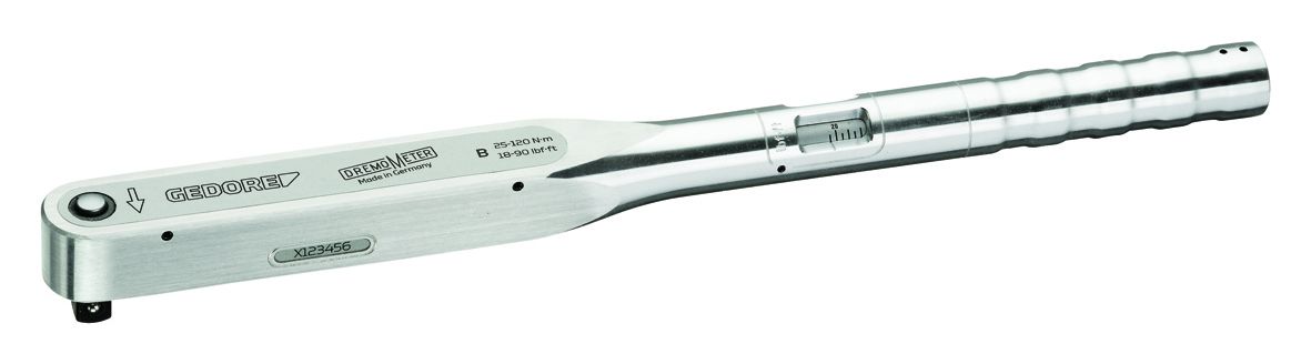 Technical advantage/function: • Pre-set value locking and safety device (A+S) eliminates the possibility of unintentional or manipulated adjustment, thereby representing more process reliability of the user • Classified to DIN EN ISO 6789:2003 Type II Class A, with a factory certificate. Working accuracy: +/- 3 % tolerance of scale set torque. The specification of the standard (+/- 4 %) is exceeded. • Lightweight and robust (as housing is made of an aluminium alloy), very workshop-friendly • No inaccuracies whether used with both hands or held away from the handle (as for standard torque wrenches). Both the square drive and fulcrum are on an axis which ensures a high degree of user safety; can be extended to reduce the user's working load. • Extremely low wear attributable to reduced forces in a unique lever mechanism • Forged lever chain from our own quality forge • Maximum precision even when subjected to extreme continuous use • Long life cycles and tool lives • Easy operation - fast and safe torque tightening • Single- and double-square drive for controlled bi-directional tightening Use: • Controlled screw tightening in the range 6 - 3000 N·m • For use in almost all industrial manufacturing areas Features: • With certificate acc. to DIN EN ISO 6789, traceable via in-house DAkkS laboratory to national standards • Automatic short-path actuation with tactile impulse and audible signal • Dual scale with corresponding scale graduation (see table) • Type B, BC, C with push-button release • Pre-set DREMOMETER for serial production wherever the same value always needs to be applied