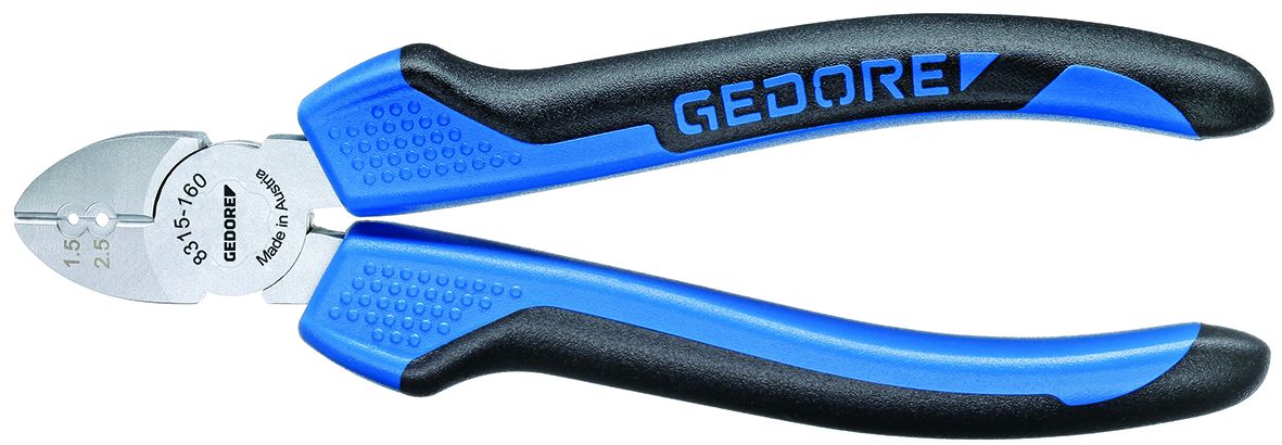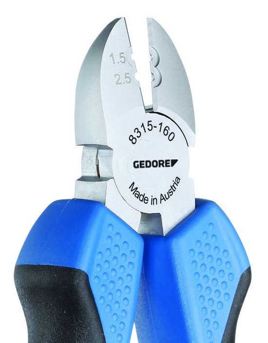 • Double-function electricians’ side cutters: for cutting and stripping wire • Stripping notches for single- and multi-core wire, 1.5 mm2 and 2.5 mm2 conductor cross-section • Induction-hardened precision cutting edges, hardness 61 - 63 HRC • GEDORE special hardened and tempered steel, drop-forged, oil-hardened and annealed • JC = chrome-plated, with 2-component handles