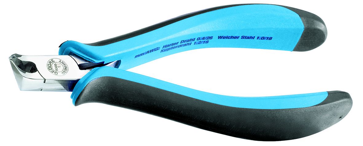 • Pointed head, cutting edges angled 55 °, with fine bevel • For working in confined spaces • Induction-hardened precision cutting edges, hardness 61 - 63 HRC • Cutting values: Hard steel: 0.4 mm/AWG 26 Soft steel: 1.0 mm/AWG 18 Copper wire: 1.2 mm/AWG 16 • With opening spring • ESD = electrostatic discharge protection