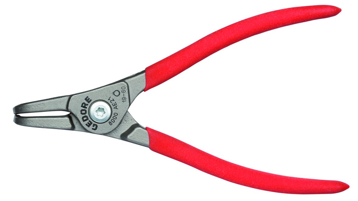 • For safety rings as per DIN 471, DIN 983 • DIN 5254 Form B • 90° angled jaws • Inside-positioned opening spring • Pliers basic body in GEDORE chrome-vanadium special steel • Pressed-in tips of highly wear-resistant roller bearing steel • Twisting-impeding tip geometry • Screwed joint connection • Steel-grey with red-dipped anti-slip handles