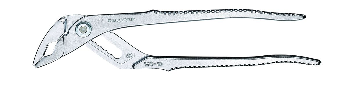 • Acc. to DIN ISO 8976 Form A • Lay-on slip joint and toothed recess • Induction-rehardened serrated faces, with finger protection • Clamps automatically on pipes and nuts • GEDORE special chrome-vanadium steel, chrome-plated • Model C = handles cross-hatched • Model JC = with 2-component handles • 145 10 = 7 settings, with extra narrow jaws • 145 15 = 9 settings • 145 20 = 11 settings