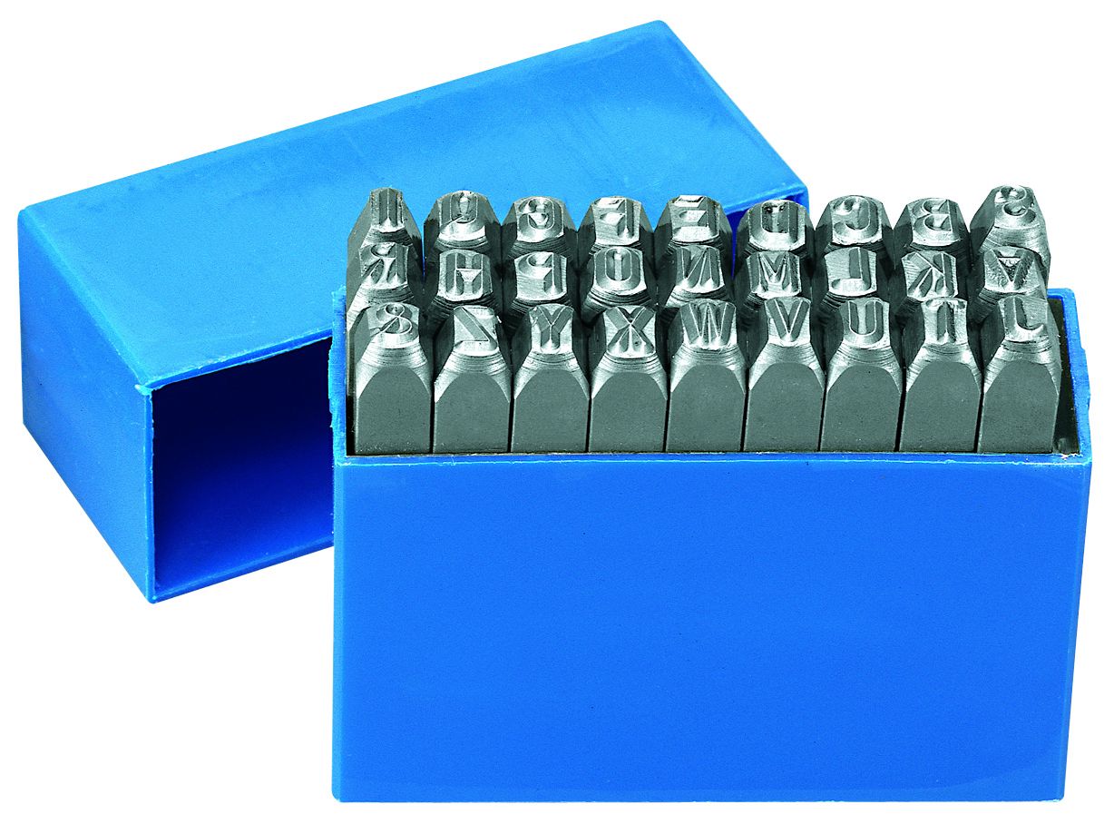 • To label finished parts such as signs, tools, etc. • Made from hardened steel with hardened handle and tempered striking head • In blue plastic box • No. 2200 = 9 numbers, 6 mm printing height • No. 2201 = 27 letters (A - Z, &), 6 mm printing height