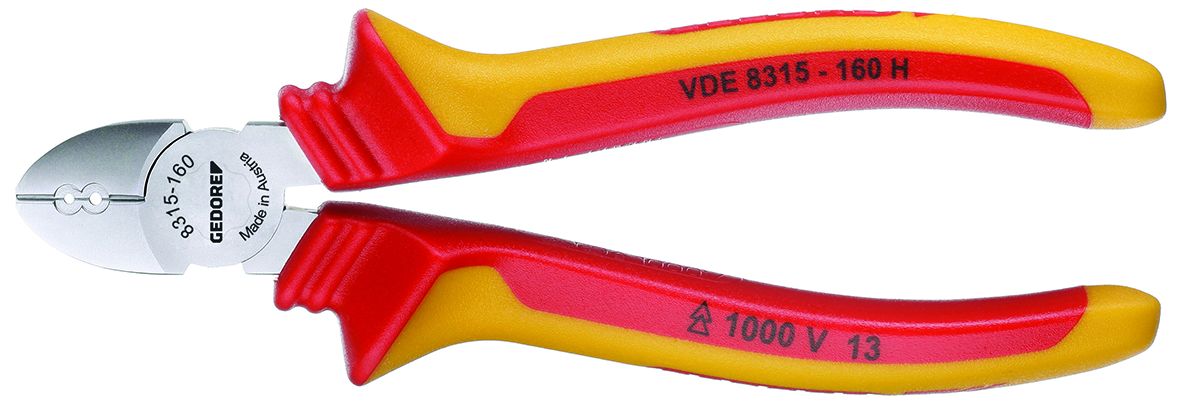 • Double-function electricians’ side cutters for cutting and wire stripping • Stripping holes for single- or multi-core conductors 1.5 and 2.5 mm2 • Induction-hardened precision cutting edges • GEDORE special hardened and tempered steel, chrome-plated • Handles with VDE insulating sleeves up to 1000 V, acc. to EN 60900/IEC 60900