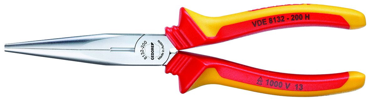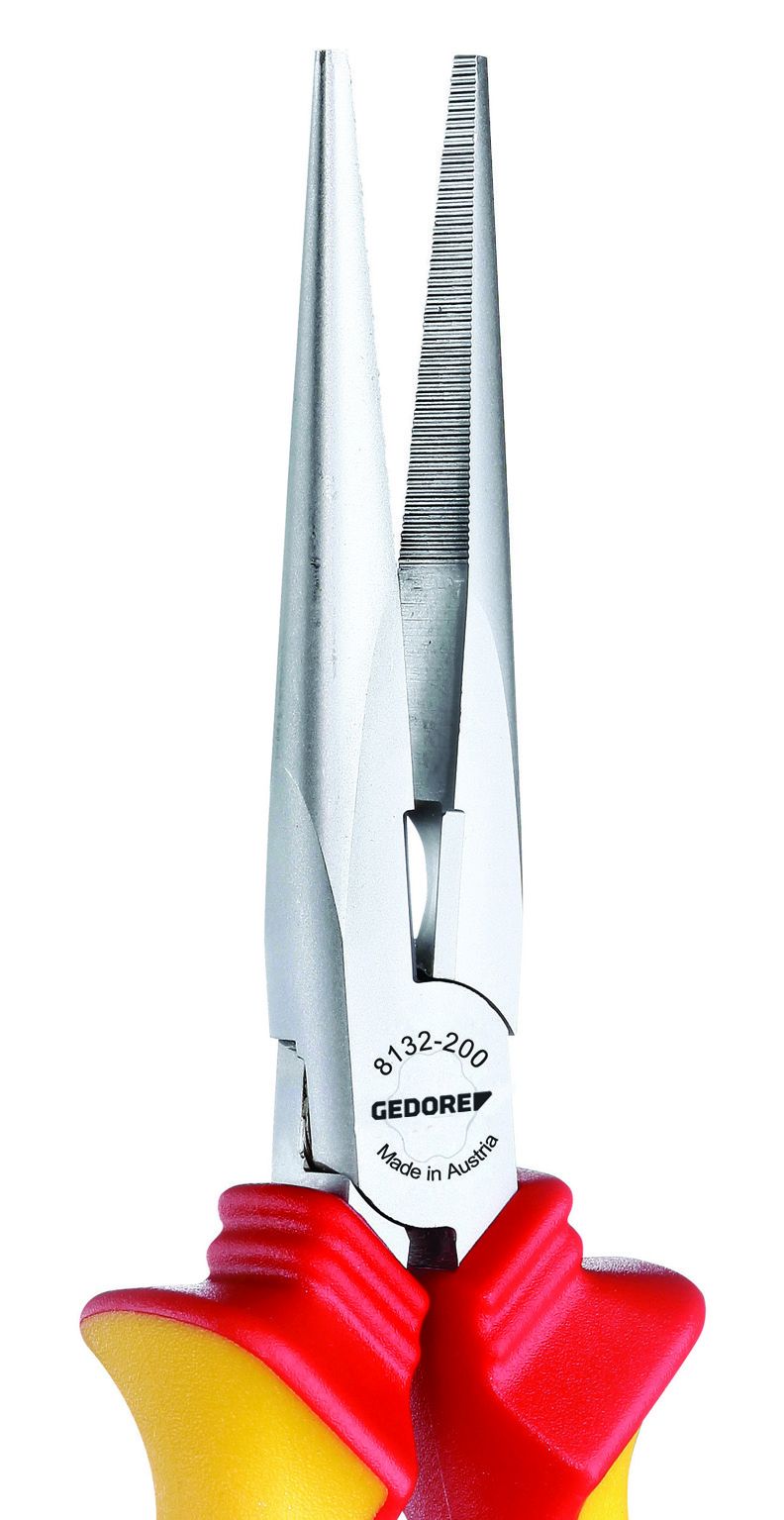 • Long, flat-round jaws, straight gripping faces, serrated • Induction-hardened precision cutting edges, hardness 61 - 63 HRC • GEDORE special hardened and tempered steel, chrome-plated • Handles with VDE insulating sleeves up to 1000 V, acc. to EN 60900/IEC 60900