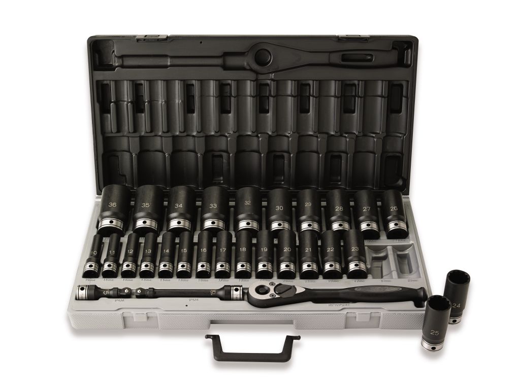 26pcs of Deep Sockets: 10mm,11mm, 12mm, 13mm, 14mm, 15mm,16mm, 17mm, 18mm, 19mm, 20mm,21mm, 22mm, 23mm, 24mm, 25mm,26mm, 27mm, 28mm, 29mm, 30mm,32mm, 33mm, 34mm,35mm, 36mm.