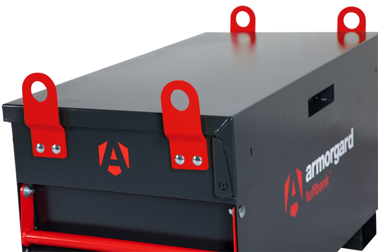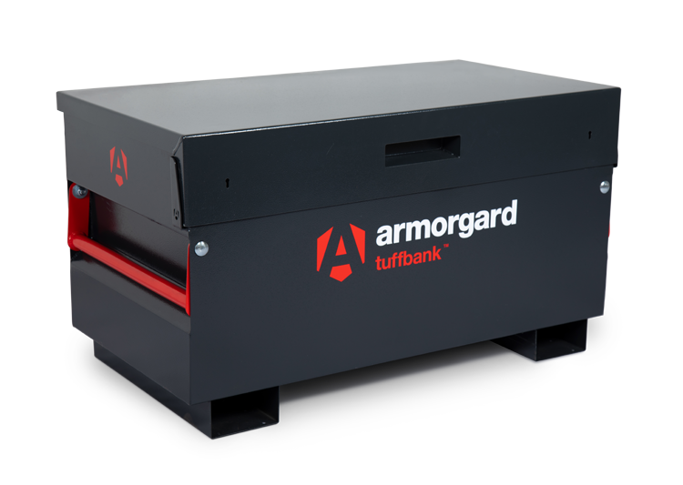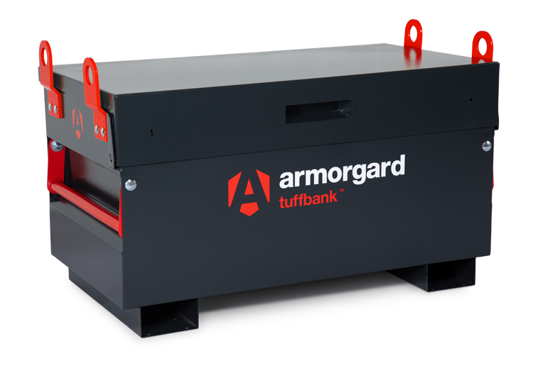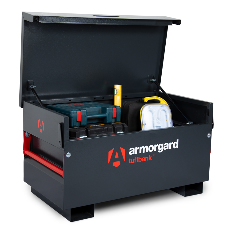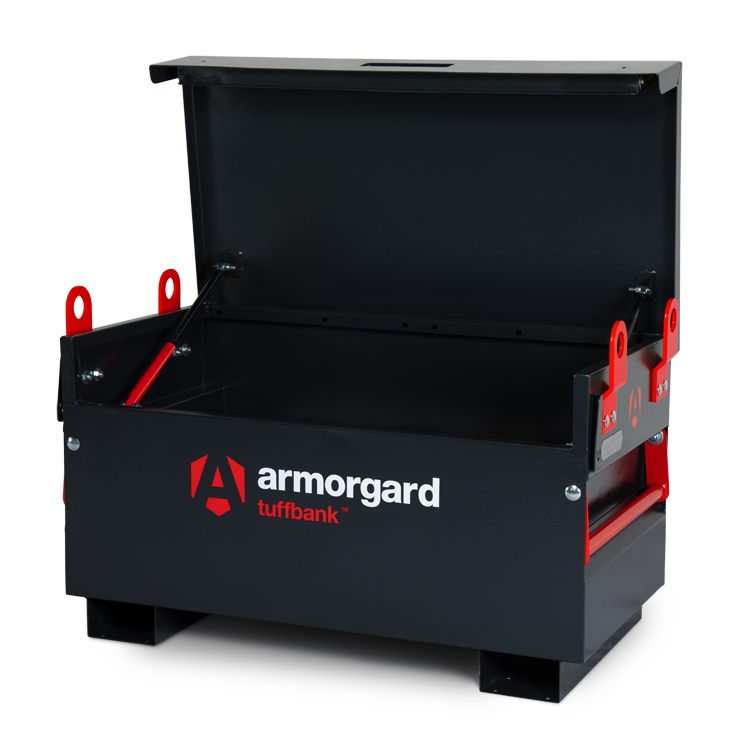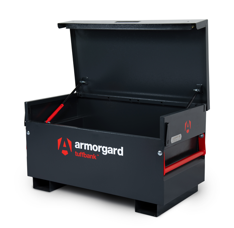 Tuffbank Site Box. New & improved version tested and certified by Sold Secure & Secure by Design. Includes a host of innovative features such as anti-jemmy system, hardened steel plates, steel reinforcements & inset handles requiring less space. Extremely strong, sturdy and secure and incredible value for money. Ultra robust 5-lever deadlocks on both sides & anti-cut rollers in deadbolt, strong chubb-style keys supplied. Dataplate and serial numbered for overnight key replacements. Gas struts fitted as standard plus the super-safe new SlamStop lid stay. Available with free-fitting storage shelf, & PowerShelf with 4 USB ports for for easy & convenient charging of mobile devices plus 4 power sockets for secure charging of tools. Cable passing point for up to two cables. Castors and lifting eyes also available.