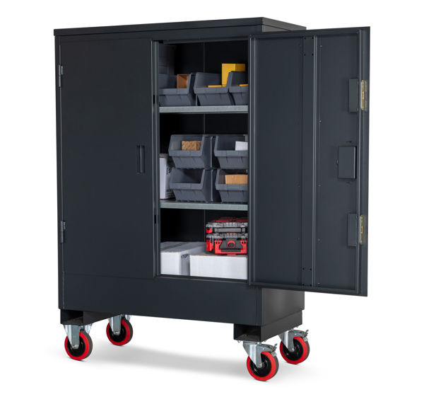Fittingstor, Mobile Fittings Cabinet. Designed to secure & organise copper fittings and cable alongside the tools & equipment. Heavy duty sheet steel construction with robust removable shelving and removable plastic compartments. Fitted with twin 5 lever deadlocks and serial numbered for replacement keys. Supplied on 4 x 6''extra heavy-duty castors and recessed handles to enable it to be easily manoeuvred