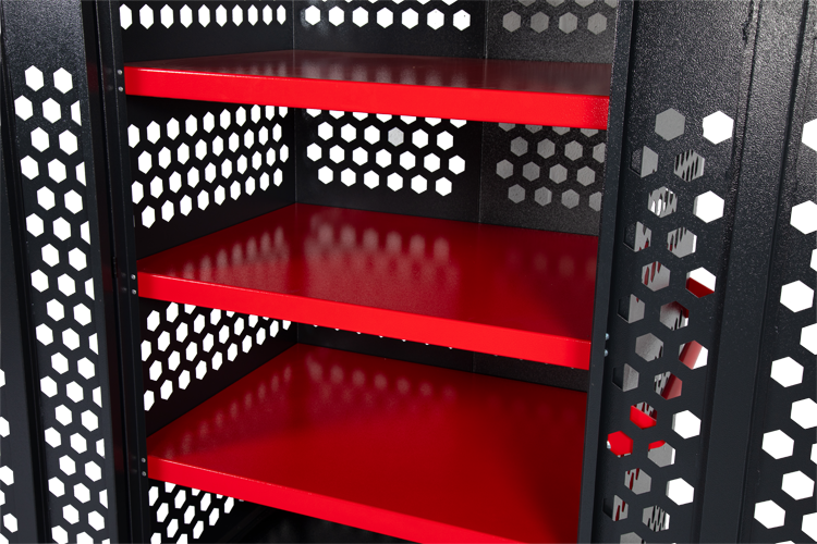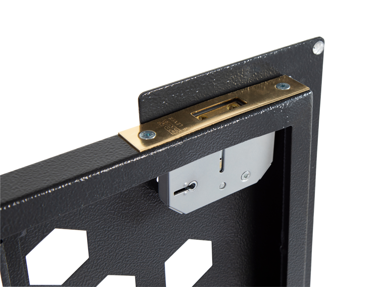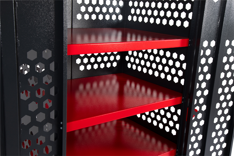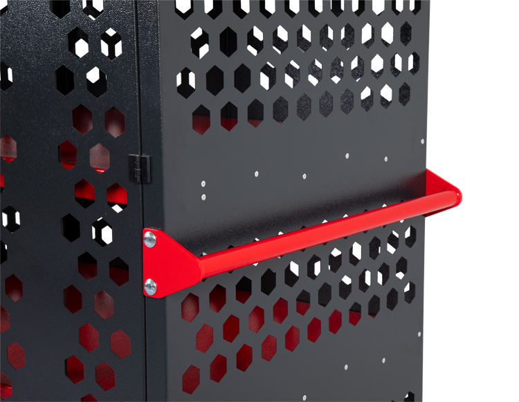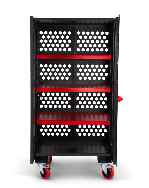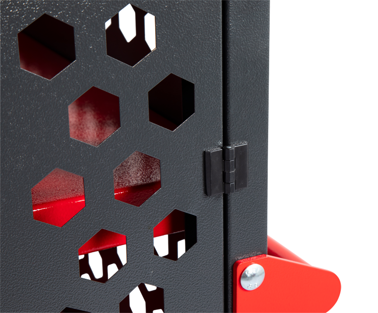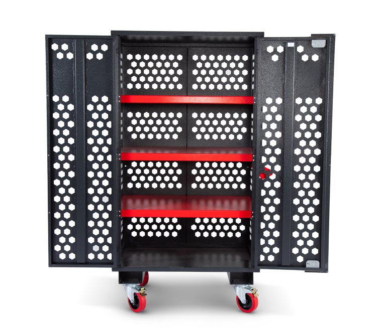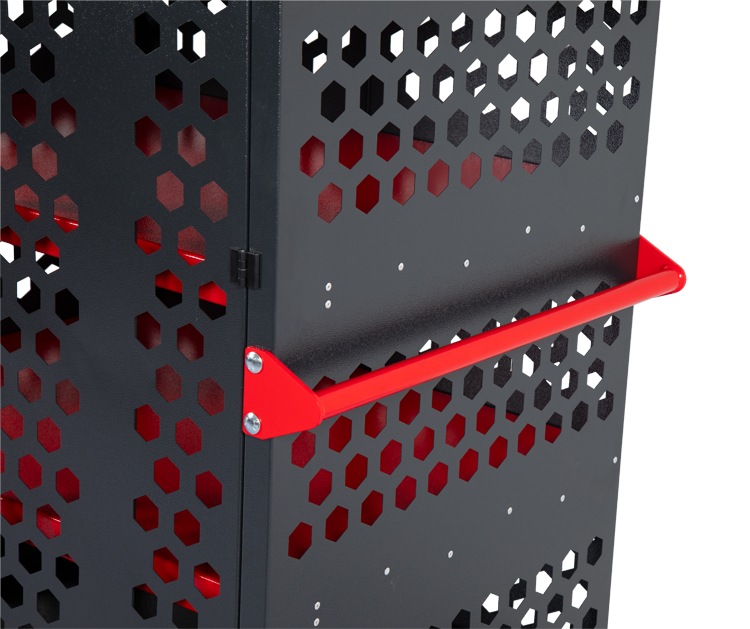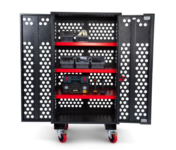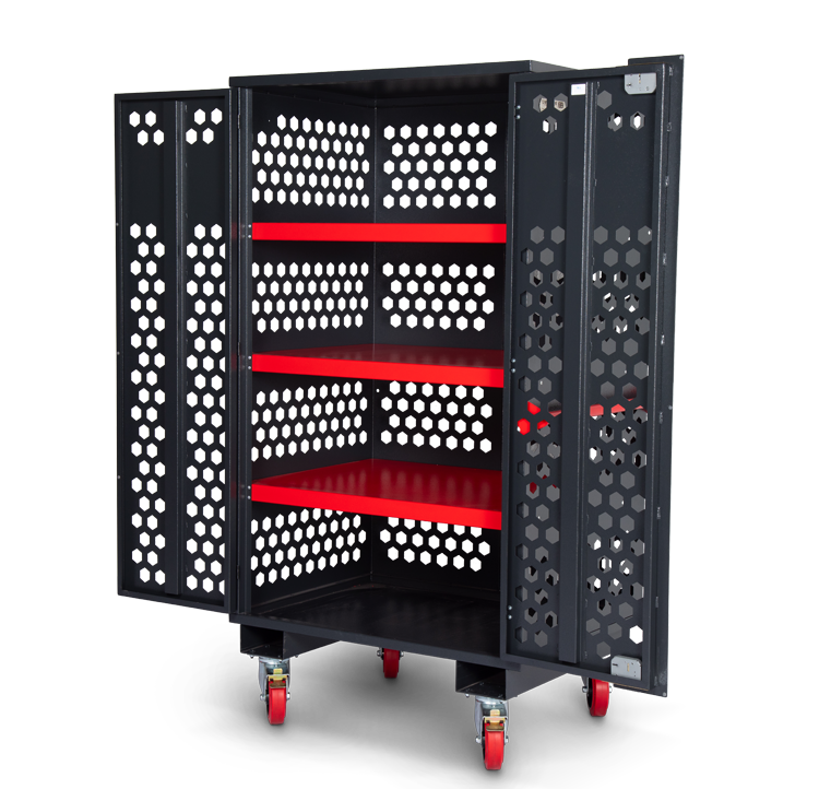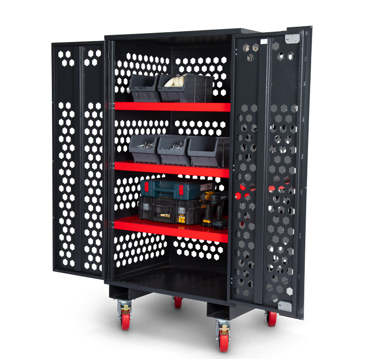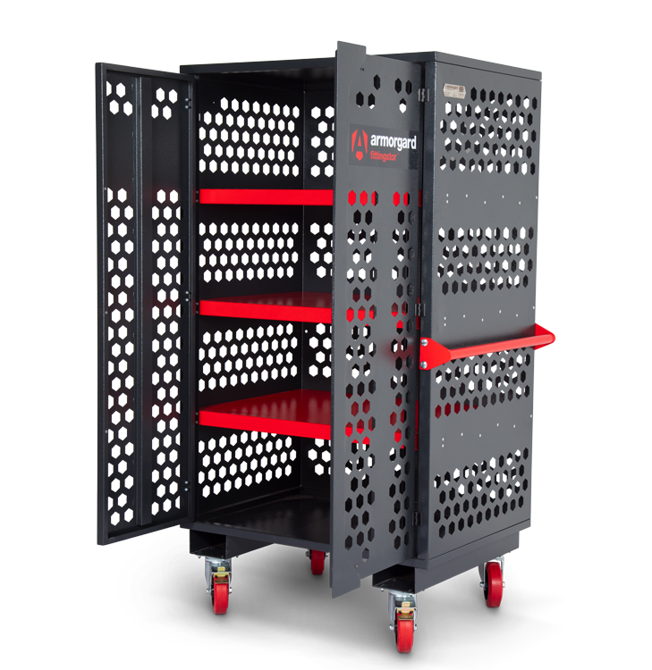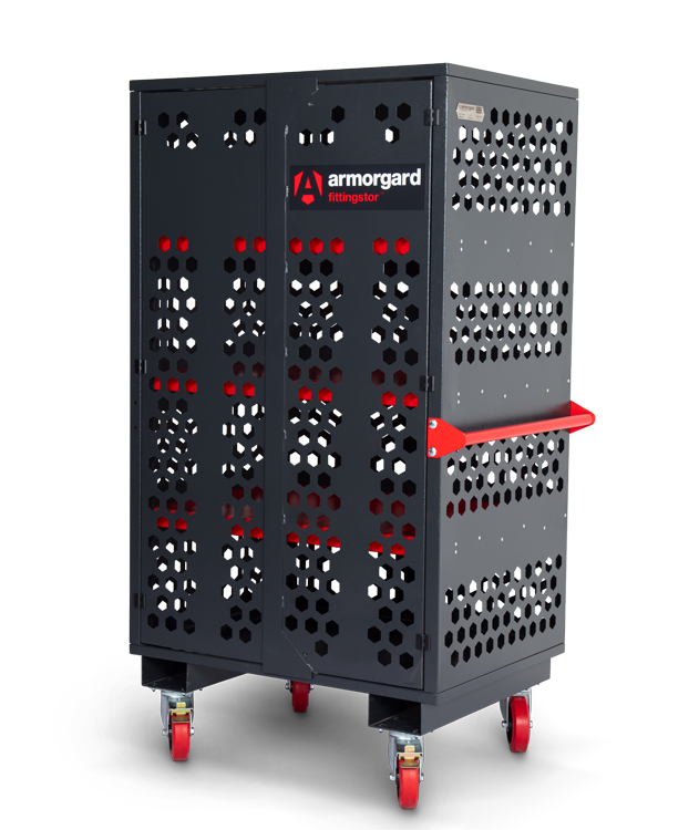 Fittingstor, Mobile Fittings Cabinet. Robust storage unit, constructed from sturdy perforated steel sheet. Ideal for storing fixtures and fittings for easy visibility of contents. Contents are visible at all times for easy identification. Forklift skids are built in for easy transportation. Comes with 3 sturdy, fixed shelves. Robust powder coat provides weatherproofing and durability. Five lever deadlocks top and bottom for ultimate security. Strong ergonomic handle making it easy to move around site or between rooms.