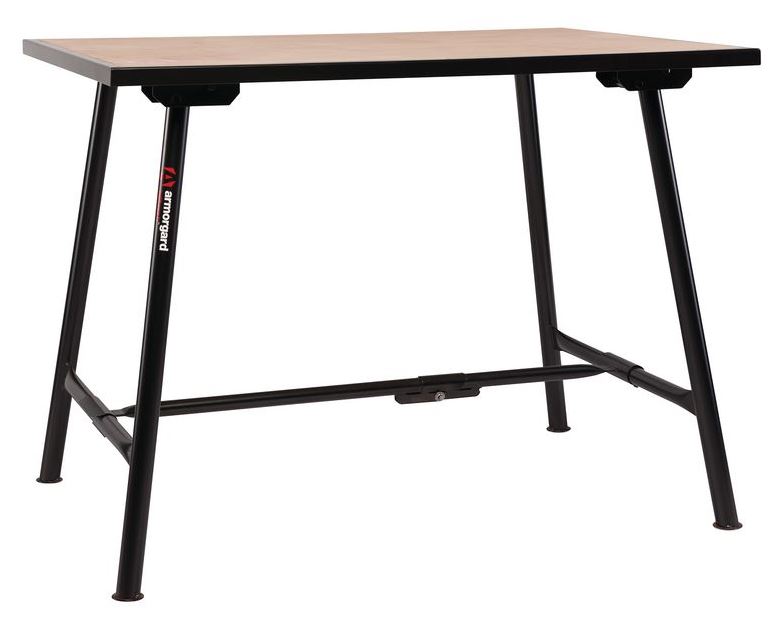 TuffBench, Folding workbench. The TuffBench is a durable workbench, functional for contractors on construction sites, by means of a temporary work platform. The sustainable surface is manufactured from pressed timber and designed to be long lasting, making it simple to attach working tools (e.g. vices and pipe threaders etc.). The legs can be folded up, which means it is a considerably smaller unit to store when not in use, and makes it easier to move around site. Folding legs with a chain strap, to hold them back when in the folded position, No detachable parts, keeps it together as one unit, Durable timber work surface and powder coated frame, to maximise the product usability.