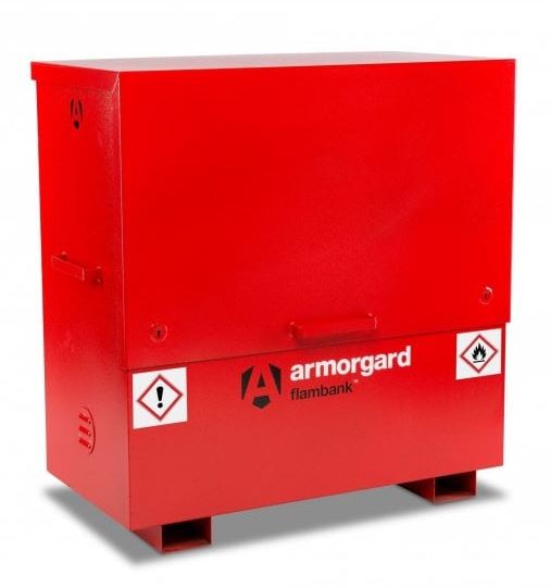 Flambank Hazardous Storage Chest. Fully complies with all regulations for the safe storage of chemicals and flammables, Popular for external fixed applications where security is also an issue, Fully welded and tested sump base to prevent leakage, Ultra-robust 5-lever deadlocks on both sides and anti-cut rollers in deadbolt, Robust chubb style keys supplied, High and low level ventilation to prevent build-up of fumes, Flame arrester gauze fitted on all boxes, Finished in bright red with relevant hazard warning signs fitted as standard, Built to specification for ½ hour fire resistant, Supplied with 1 x removable shelf, Castors available to suit