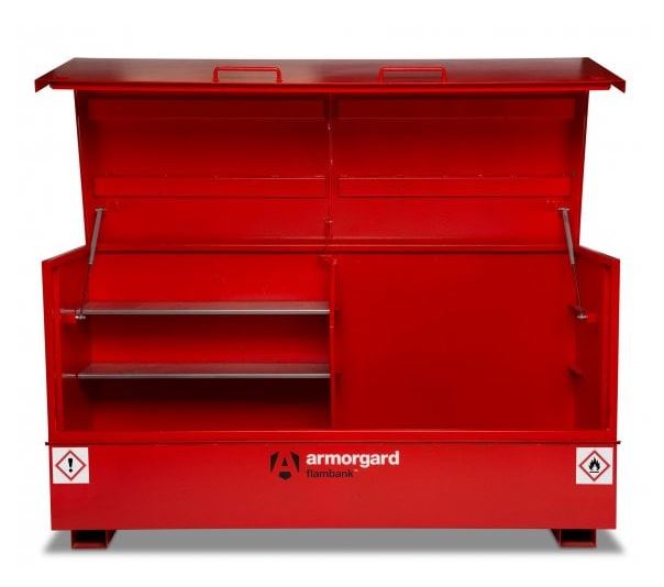 Flambank Hazardous Storage Chest. Fully complies with all regulations for the safe storage of chemicals and flammables, Popular for external fixed applications where security is also an issue, Fully welded and tested sump base to prevent leakage, Ultra-robust 5-lever deadlocks on both sides and anti-cut rollers in deadbolt, Robust chubb style keys supplied, High and low level ventilation to prevent build-up of fumes, Flame arrester gauze fitted on all boxes, Finished in bright red with relevant hazard warning signs fitted as standard, Built to specification for ½ hour fire resistant, Supplied with a divider in the centre of the box and 2 x removable shelf