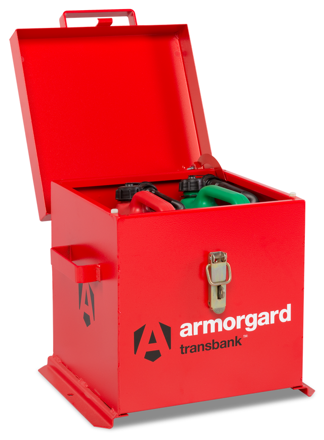 Transbank Hazardous Transit Box. Designed specifically for storing or transporting smaller quantities of flammables or chemicals, Fully complies with all regulations. Designed around the sizes of ‘jerry’ cans and 5 litre fuel and chemical cans, TRB1 will hold 2 x 5l cans, Fully welded and tested sump base to prevent leakage,Ventilated to prevent a build up of fumes, Flame arrester gauze fitted as standard, Overcentre catch with padlock facility, Finished in bright red with relevant hazard warning signs, Built to a specification for 30 minute fire resistant, Pre-drilled holes for bolting down