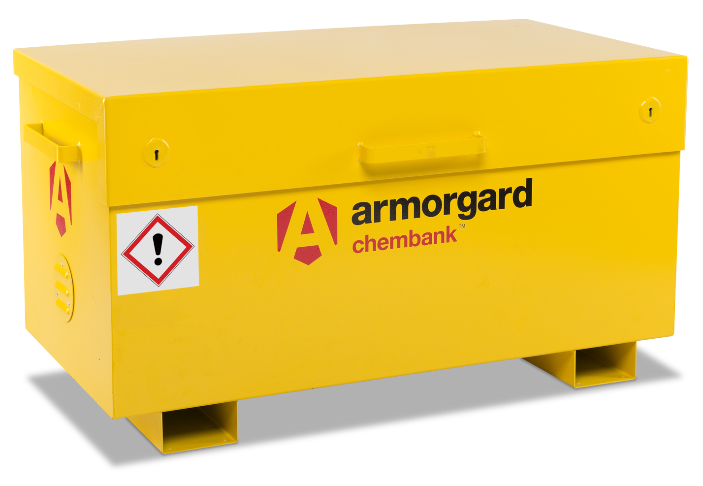 Chembank Hazardous Storage Box. Fully complies with all regulations for the safe storage of chemicals, Popular for external fixed applications where security is also an issue, Fully welded and tested sump base to prevent leakage, Ultra-robust 5-lever deadlocks on both sides and anti-cut rollers in deadbolt, Robust chubb style keys supplied, High and low level ventilation to prevent build-up of fumes, Flame arrester gauze fitted on all boxes, Finished in bright yellow with relevant hazard warning signs fitted as standard, Built to specification for ½ hour fire resistance, Castors available to suit