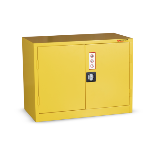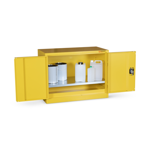 Safestor Hazardous floor cupboard, designed to be used internally for the safe storage of flammables and chemicals, such as paint and other hazardous substances as defined by COSHH guidelines. Built to a 30 minute fire resistant. Supplied with 1 galvanised shelf, Liquid-tight sump to contain spillages, Flush handles with two point locking, Reinforced doors, Powder coated paint finish, Relevant warning signs.