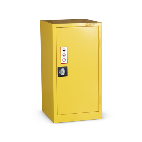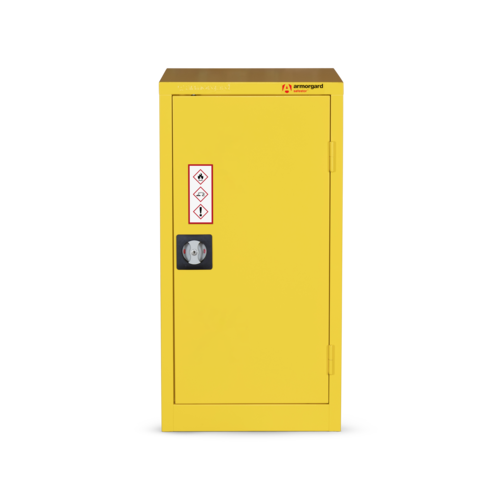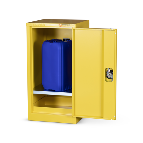 Safestor Hazardous Floor Cupboard, designed to be used internally for the safe storage of flammables and chemicals, such as paint and other hazardous substances as defined by COSHH guidelines. Built to a 30 minute fire resistant. Supplied with 1 galvanised shelf, Liquid-tight sump to contain spillages, Flush handles with two point locking, Reinforced doors, Powder coated paint finish, Relevant warning signs