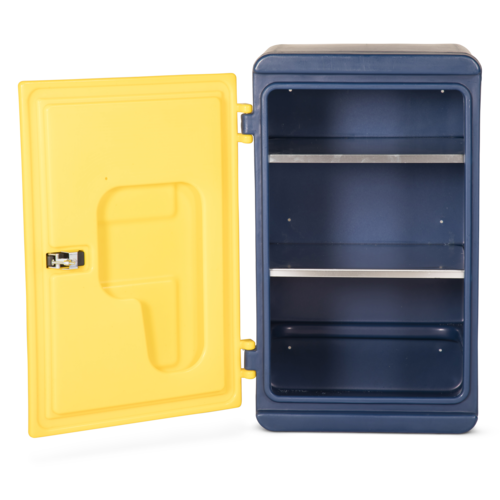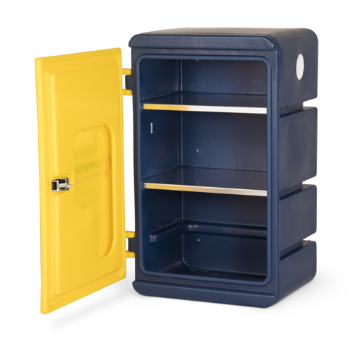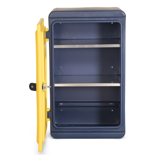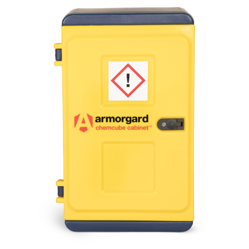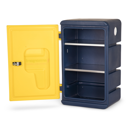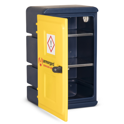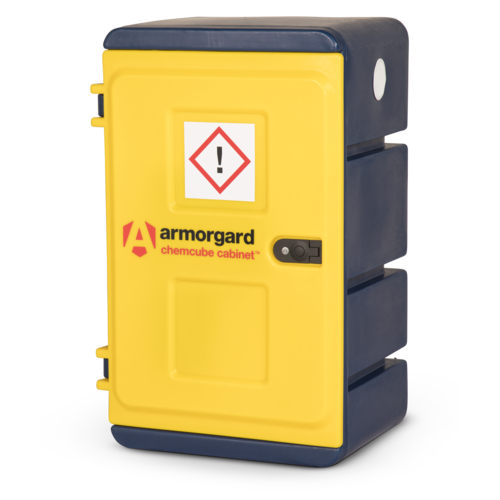 ChemCube Cabinet, wall mountable cabinet for the safe storage of pesticides and other hazardous chemicals. Fitted with two aluminium shelves (shelf capacity 40kg). Plastic is not warped affected by most chemicals that can corode metal. Vent on the side to prevent the build-up of fumes or gases. Bunded safety feature controls any possible spillages. UV protected - dont fade or go brittle.
