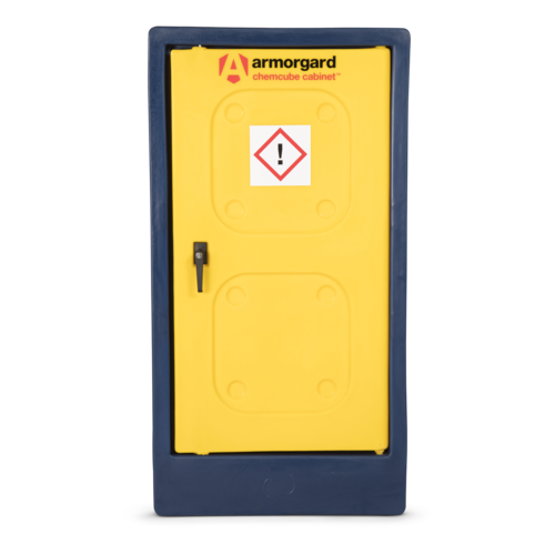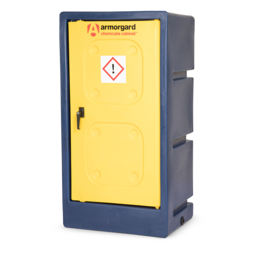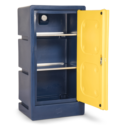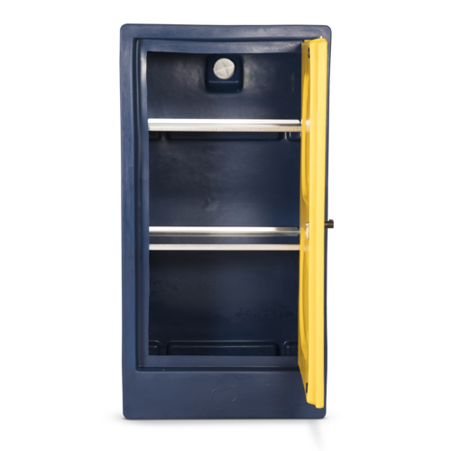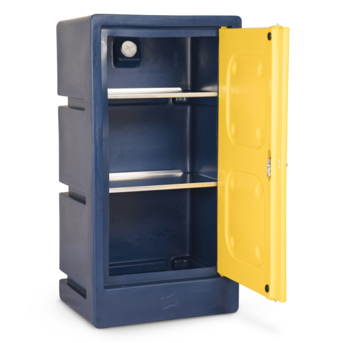 ChemCube Cabinet, free standing cabinet for the safe storage of pesticides and other chemicals. Fitted with two aluminium shelves (shelf capacity 60kg). Bunded safety feature controls any possible spillages. Plastic is not warped affected by most chemicals that can corrode metal. Vent on the rear to prevent the build-up of fumes or gases. Lockable unit for security. UV protected - don't fade or go brittle.