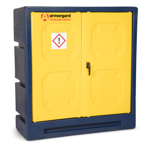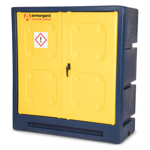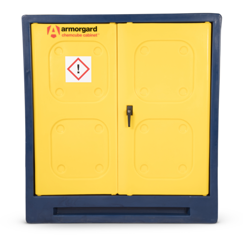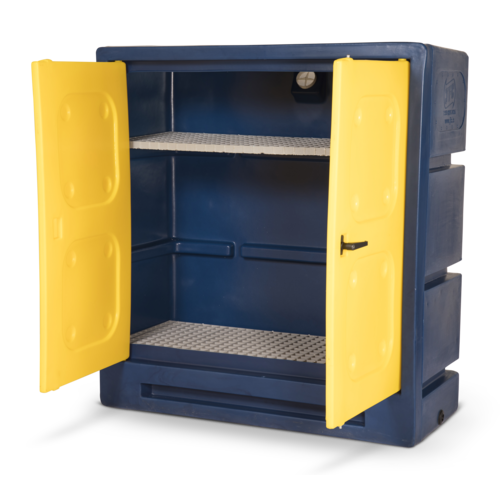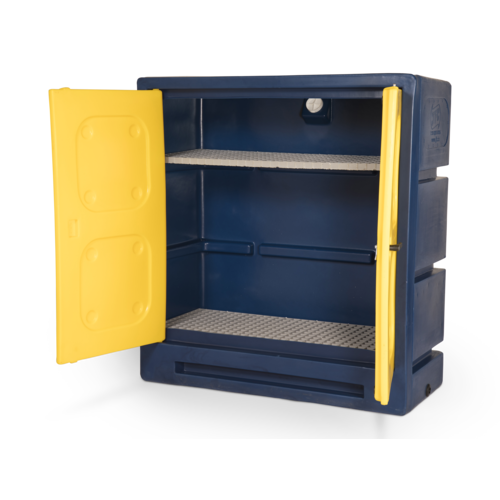 ChemCube Cabinet, durable plastic chemical storage unit, complete with two removable heavy-duty plastic mesh shelves with a load capacity of 250kg per shelf. The lockable double doors prevent unauthorised access into the unit. The 125 litre sump capacity allows for any accidental spillages.