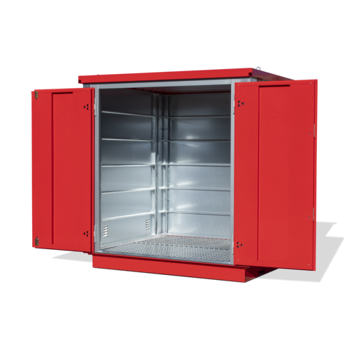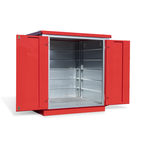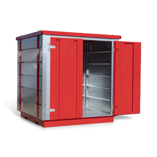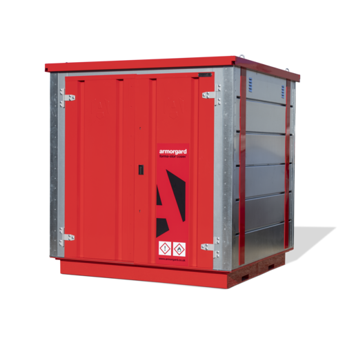 2m Forma-Stor COSHH 2075x2075x2255. Quick-assembly, modular storage unit have been purpose-designed for safe storage of hazardous substances on site. Flat-packed Forma-Stor COSHH™ units can be constructed in around 10 minutes and can be moved easily using built-in forklift pockets or lifting eyes. Galvanised panels fasten neatly together to provide a robust, weatherproof store that can be configured in numerous ways. Several HSE features have been carefully designed to enable contractors to meet COSHH regulations on-site. 30-min fire resistance, air vents and a fully welded sump to prevent leaks into the environment are included as standard. Security features also include 5-lever deadlocks and jemmy-proof joins.