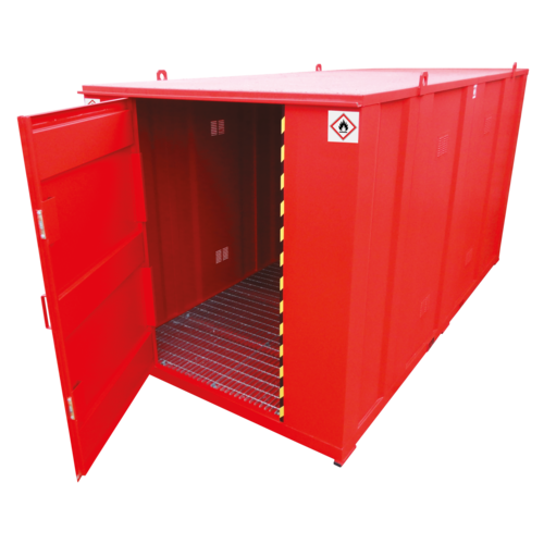 Flamstor 2000x4066x2175, Walk-in hazardous stores designed for fixed installation, Manufactured to the highest specification for the safety and security of larger quantities of chemicals and flammables. Fully complies with all relevant regulations for storing Flammables or Chemicals, Welded and tested sump to prevent leakage, Raised and removable open-steel floor, Heavy duty door with two 5 lever deadlocks, High and low level ventilation, Internal shelves fitted, Finished in bright red with relevant hazard warning signs, 30 minute fire resistant Fork lift pockets and crane lifting eyes, Can be custom built to suit specific requirements