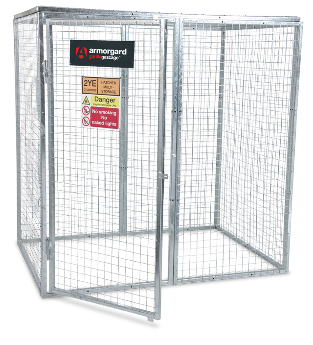 Gorilla gas cage 1821x1266×1831, Unique, modular, bolt-together gas cage, designed for the safe storage of gas cylinders. Heavy-duty construction using 25mm box section and 3mm wire mesh maximising the strength and durability of the product. Comes with a hinged door and padlock facility for security. Has the facility for bolting the cages down to the ground, which is brilliant for a fixed installation requirement, providing extra security and stability. Comes complete with all fixings and relevant signage to comply with regulations on storing gas cylinders. Galvanised finish to sustain all weather conditions and provide maximum usability and durability. Modular design allows the cage to be erected quickly and it can be made to any required size. Can be easily dismantled when not in use and stored away tidily as individual panels.