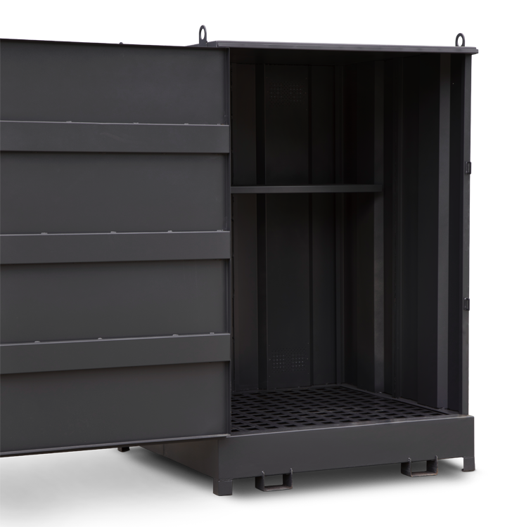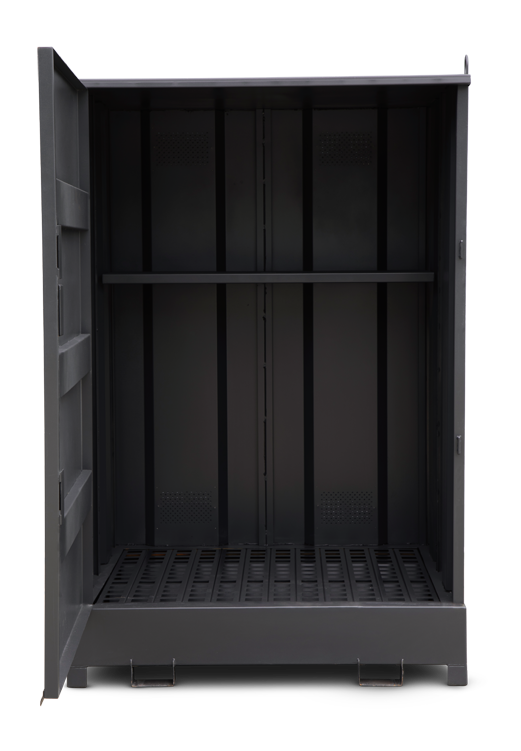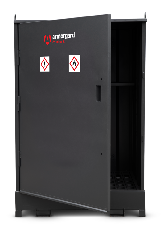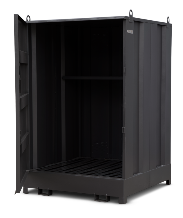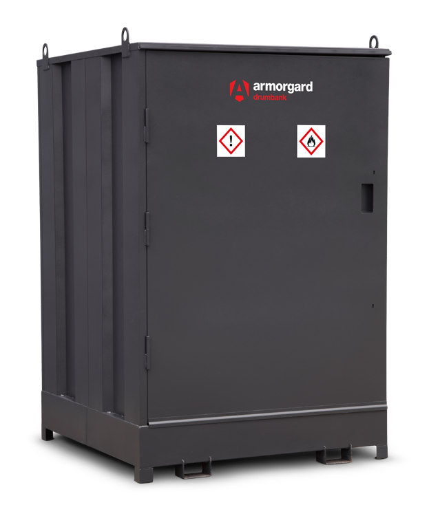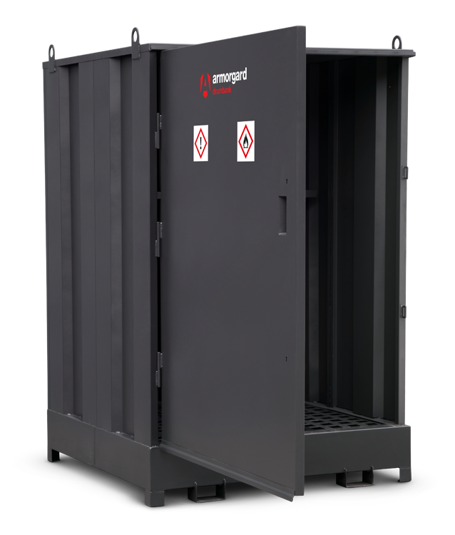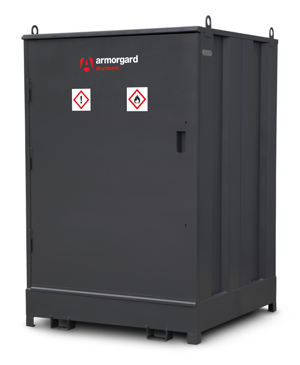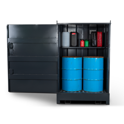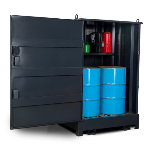 4 Drum Enclosed DrumBank, 1350x1250x1350, Protects against the weather and theft, Fully complies to all regulations for safe storage of 4 x 205 litre drums, Built to a 30 minute fire resistant. Raised & removable open floor, Very robust build quality, Fully lockable using internal 5 lever heavy-duty deadlocks, serial numbered for replacement keys, Gas struts on lid to help opening and closing