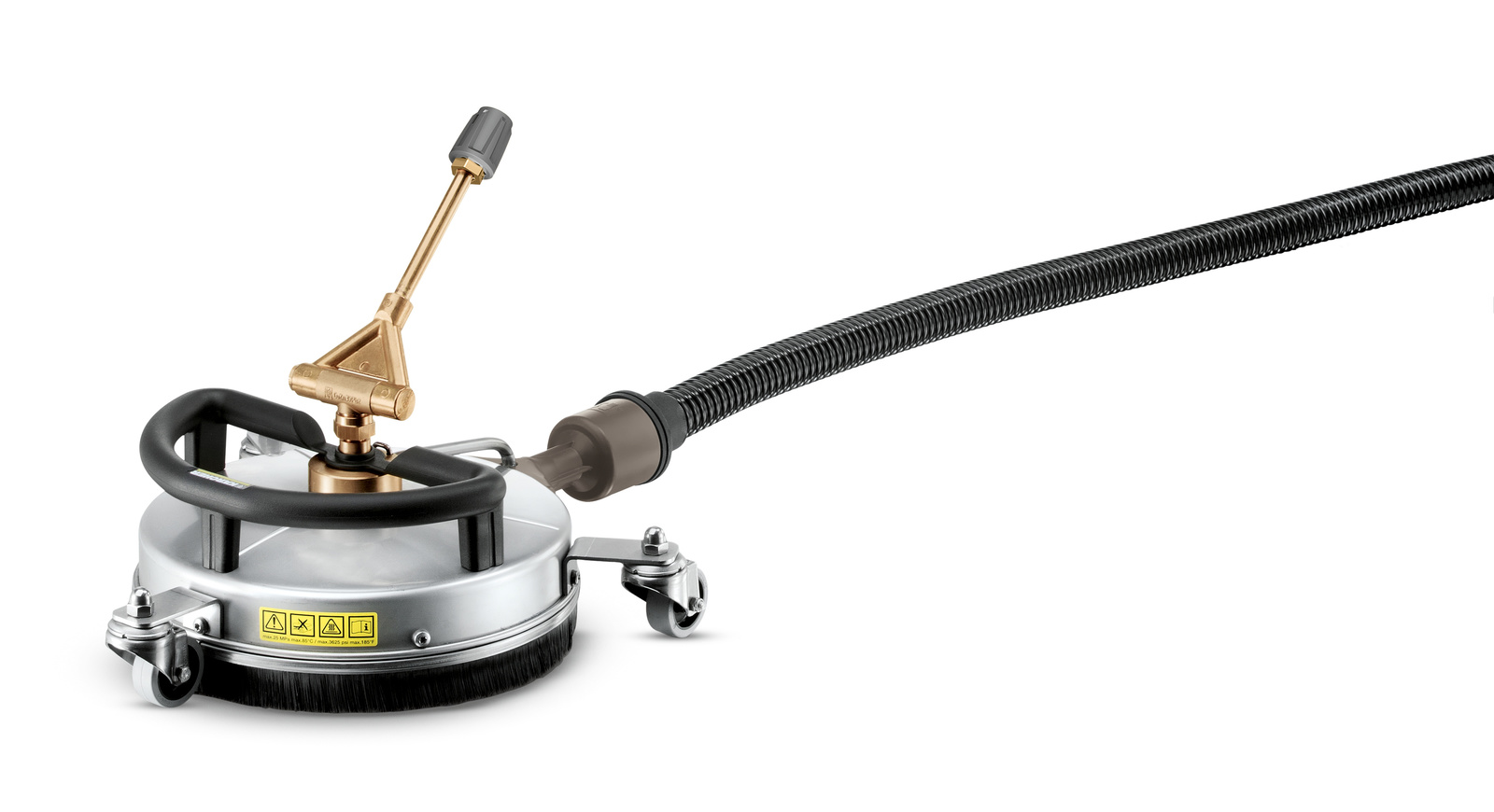 Thanks to automatic suction of the waste water, the stainless steel FRV 30 Me Surface Cleaner allows surface cleaning to be more efficient. The FRV 30 Me features a temperature resistant 7.5m polyurethane suction hose, allowing hot water cleaning up to 85 °C. Additional features include, non-marking steering rollers and double ceramic bearings. (Machine specific nozzle kit must be ordered separately).