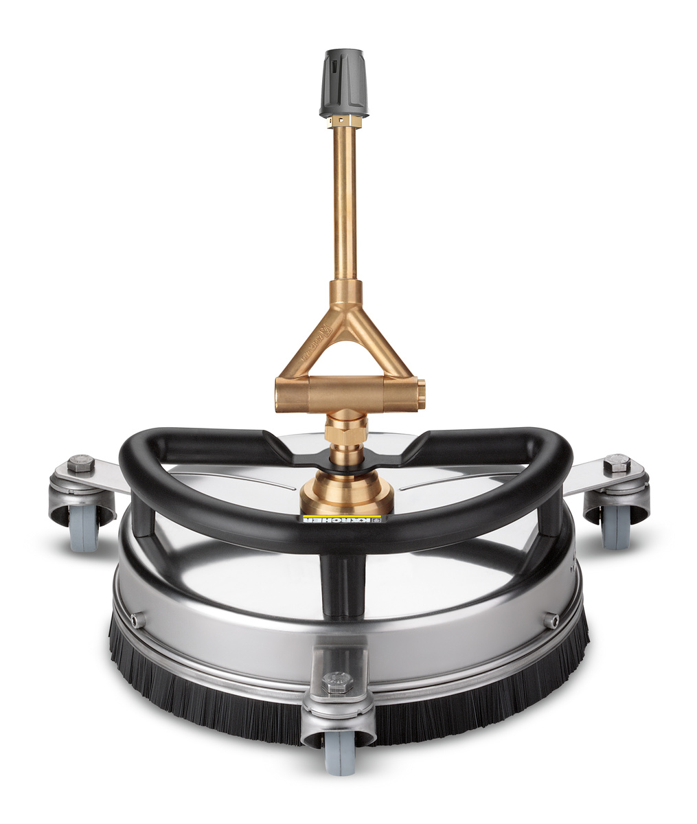 FR 30 ME high-quality, hot water resistant surface cleaner with stainless steel casing with a working width of 300 mm, ideal for indoor cleaning, e.g. food industry. Features include double ceramic bearings, non-marking swivel castors and integrated suction hose connection for removing spray water. Technical data: Max. 250 bar, 1100 l/h, 80°C. Nozzle kit must be ordered separately.