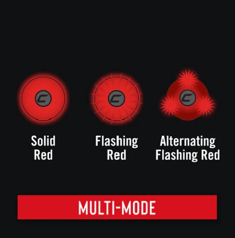 It features three red LEDs that cycle through constant red, red flashing (all 3 flash) or alternating flash (changes between the three) with each press of the push button that is located in the centre of the light.